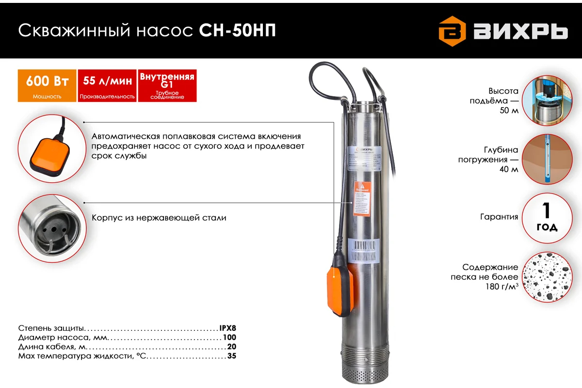 Скважинный насос Вихрь СН-50НП – это качественное и функциональное решение для организации водоснабжения на участке, которое сочетает в себе высокую производительность, долговечность и простоту в использовании.
