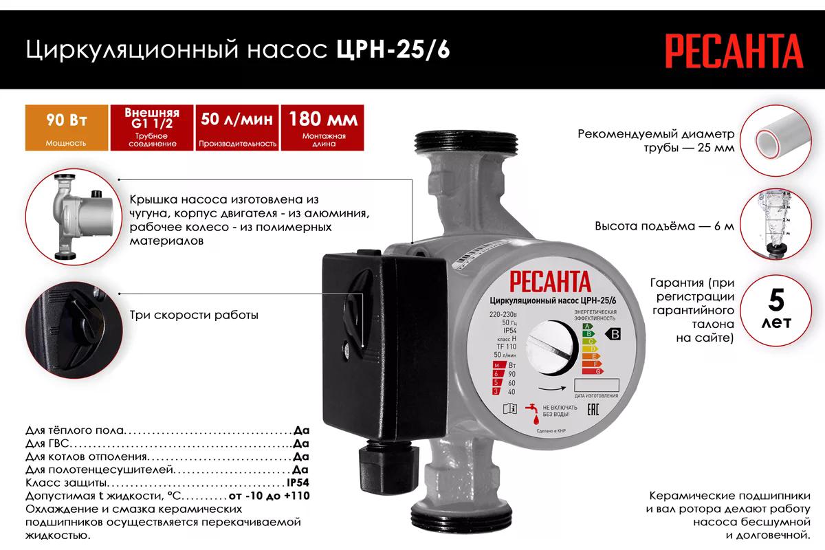 Циркуляционный насос Ресанта ЦРН-25/6 предназначен для принудительного перемещения теплоносителя в системах закрытого типа отопления.