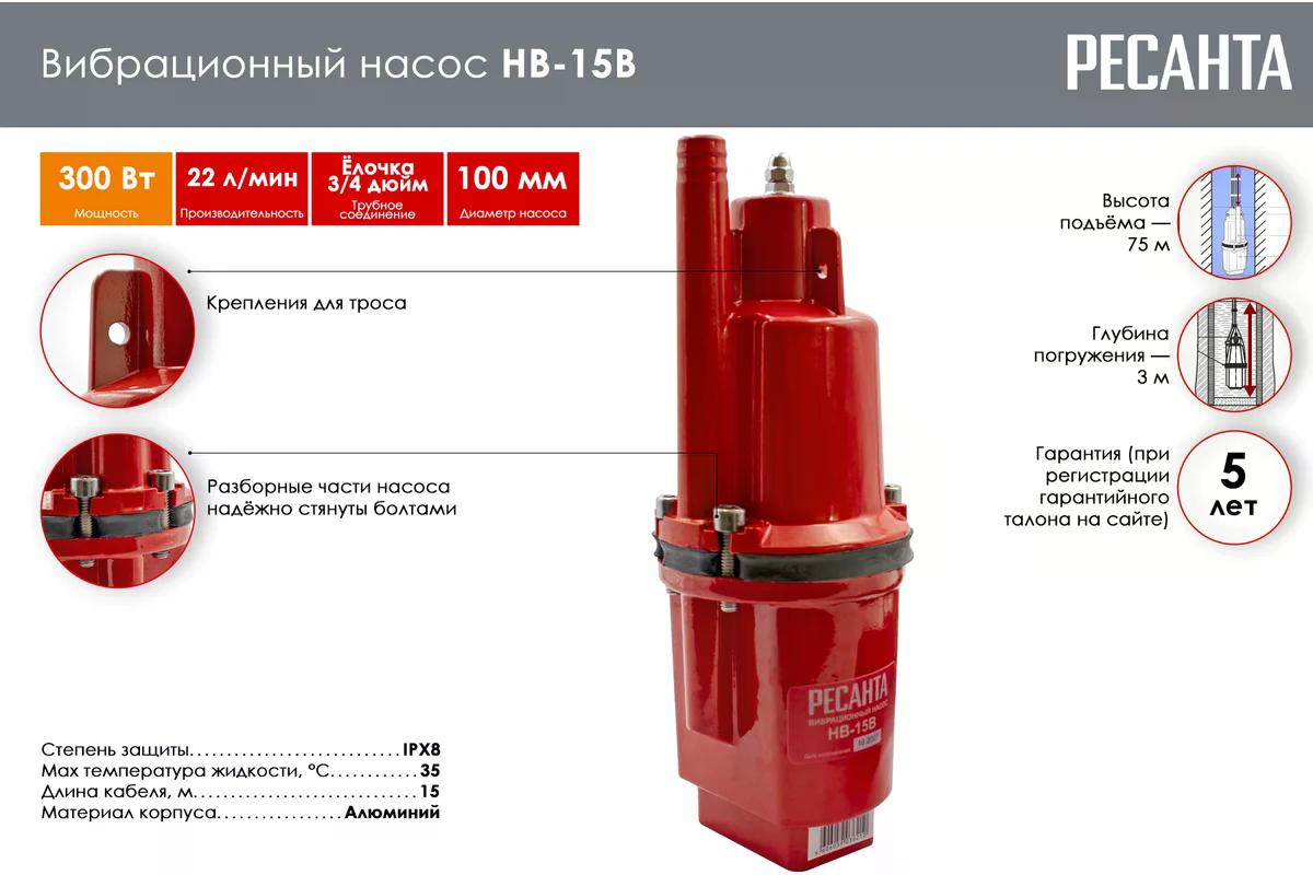 Вибрационный насос Ресанта НВ-15В обладает подойдет владельцам загородных домов, фермерам и садоводам, стремящимся обеспечить себя качественным и недорогим источником воды. Конструкция не оборудована системой защиты от перегрева, но верхний тип забора воды гарантирует постоянное погружение аппарата в воду и, соответственно, его эффективное охлаждение.
