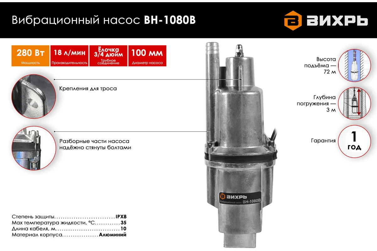 Погружной насос Вихрь ВН-1080В предлагает отличное соотношение мощности, производительности и удобства использования, делая его надежным помощником в решении вопросов водоснабжения в доме или на участке.