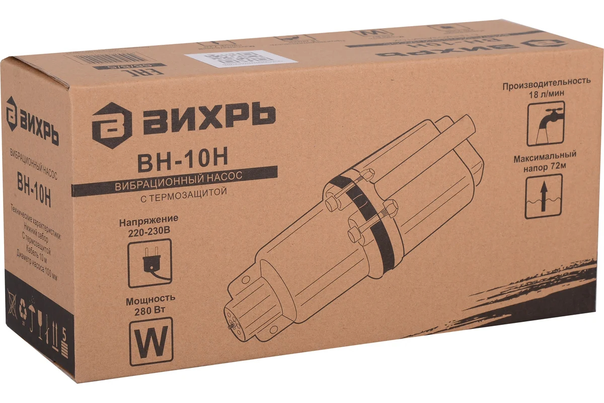 Вибронасос имеет простую конструкцию, которая не нуждается в специальном обслуживании. Благодаря нижнему забору, садовый насос Вихрь ВН-10Н может эффективно работать даже при низком уровне воды. Максимальное погружение в воду – 3 м. Комплектуется кабелем длиной 10 м, что существенно упрощает подключение к электросети. Корпус изготовлен из алюминия, который не подвержен коррозии и имеет неплохие показатели прочности. Диаметр корпуса - 4 дюйма.