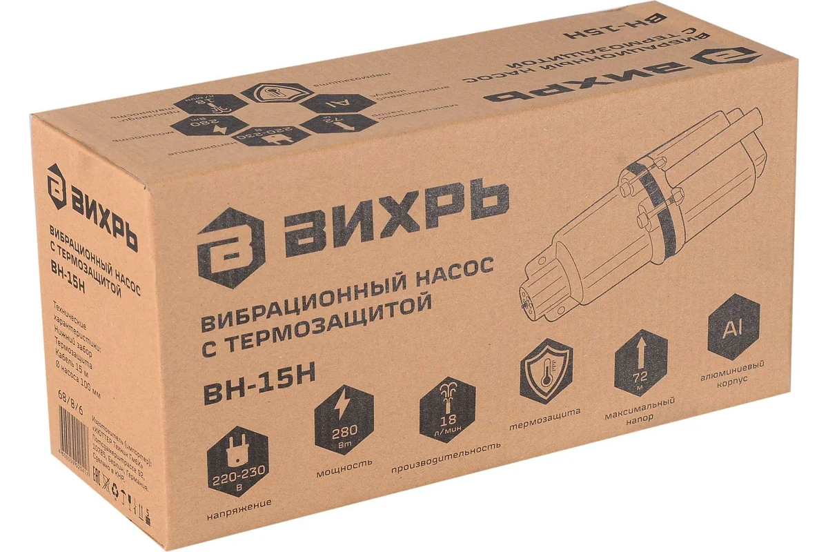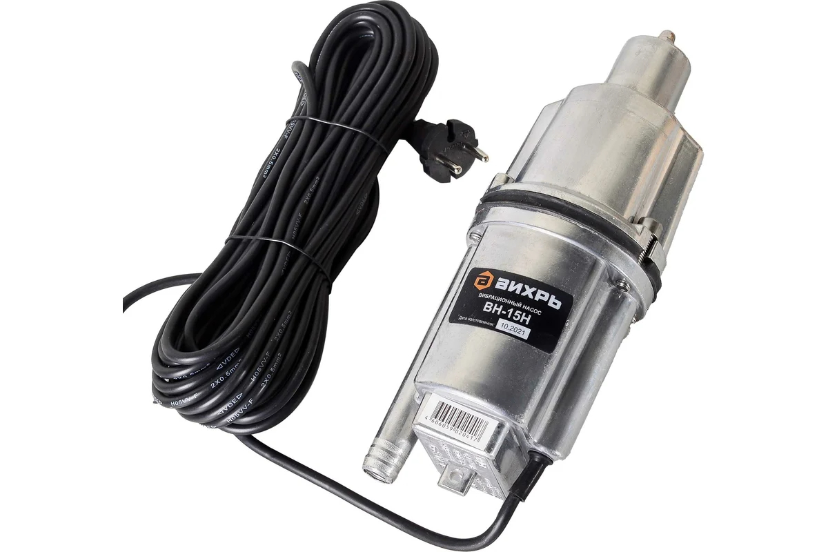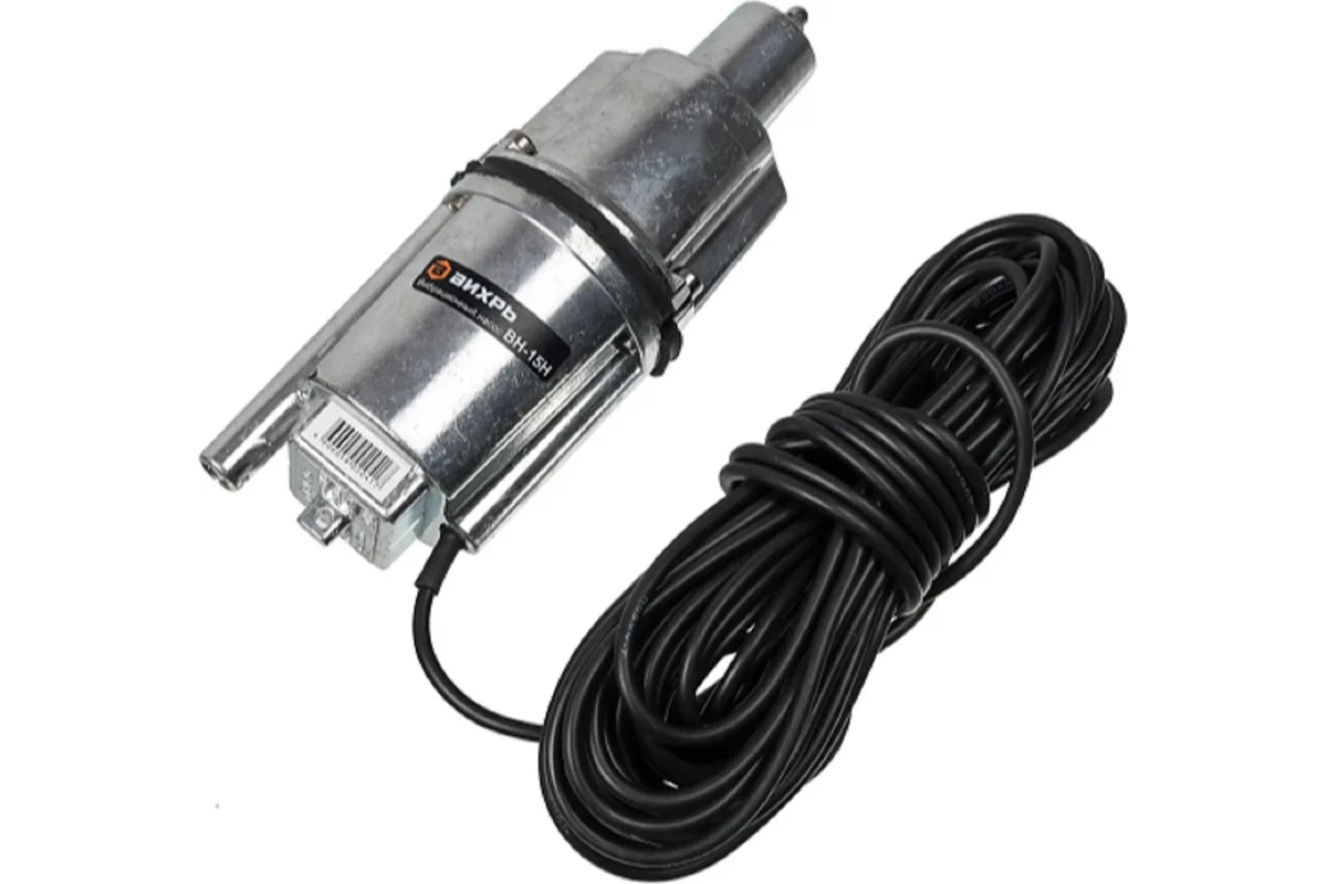Наличие 15-метрового кабеля питания дает свободу действий при подключении. Дополнительным плюсом является наличие термозащиты, которая предотвращает перегрев мотора. Простая конструкция делает насос Вихрь ВН-15Н неприхотливым в эксплуатации и избавляет от необходимости регулярного технического обслуживания. Корпус сделан из прочного алюминия, который обладает стойкостью к коррозии.