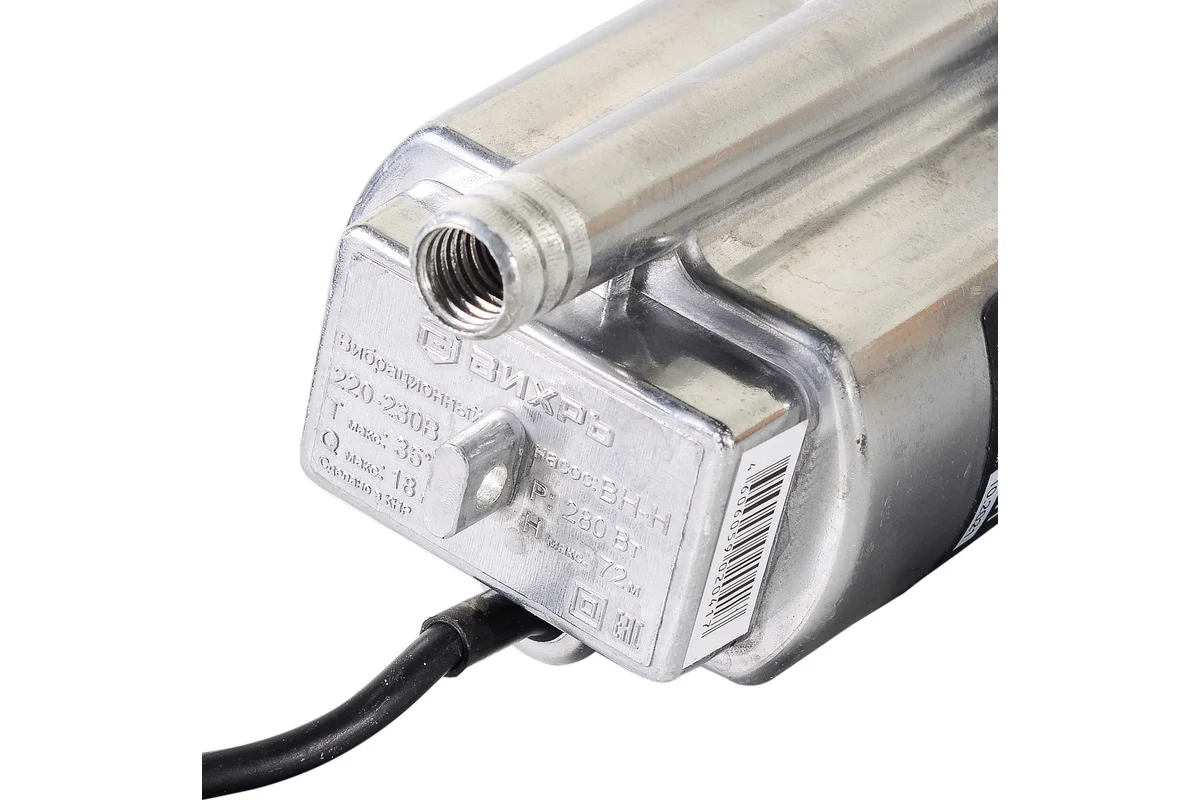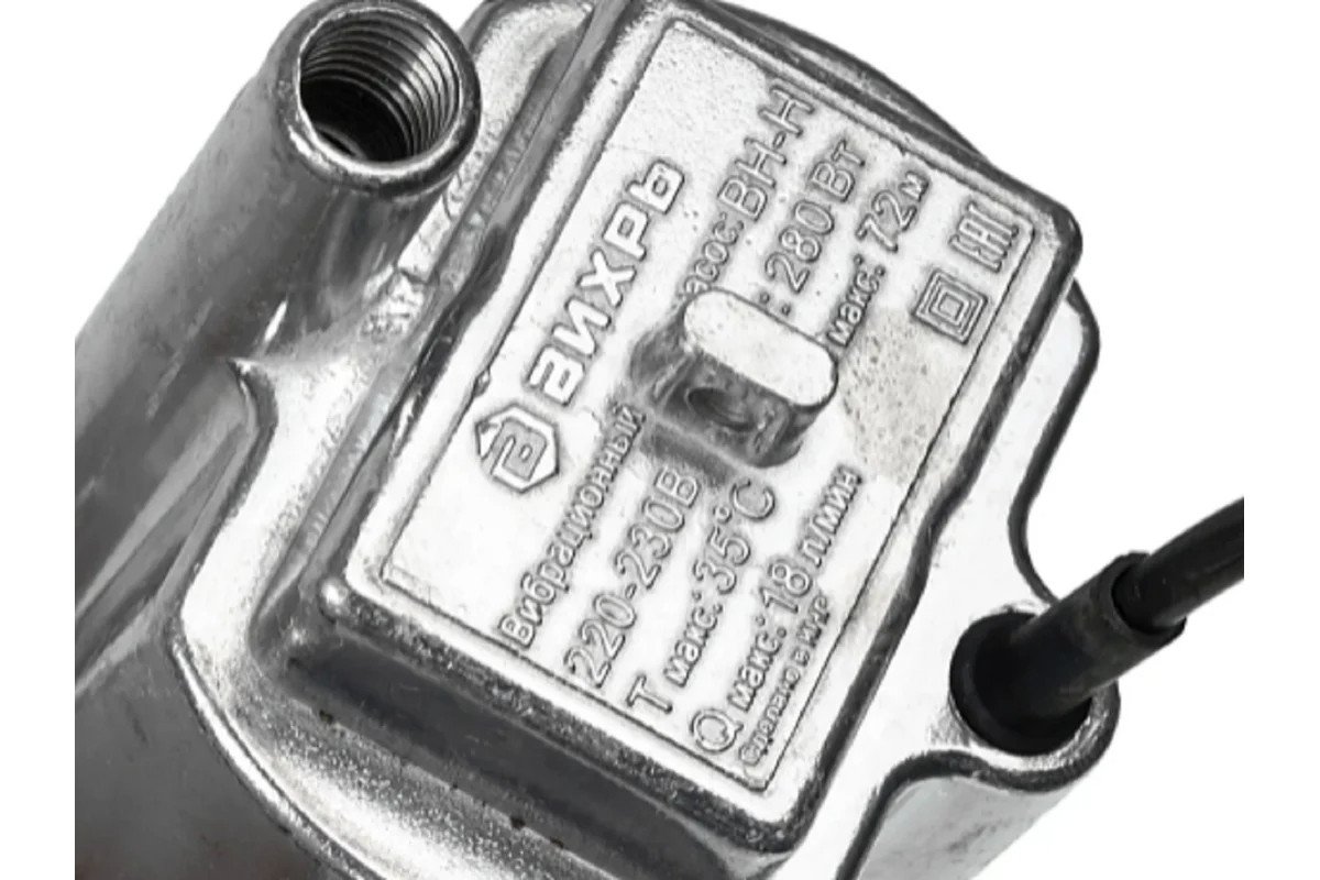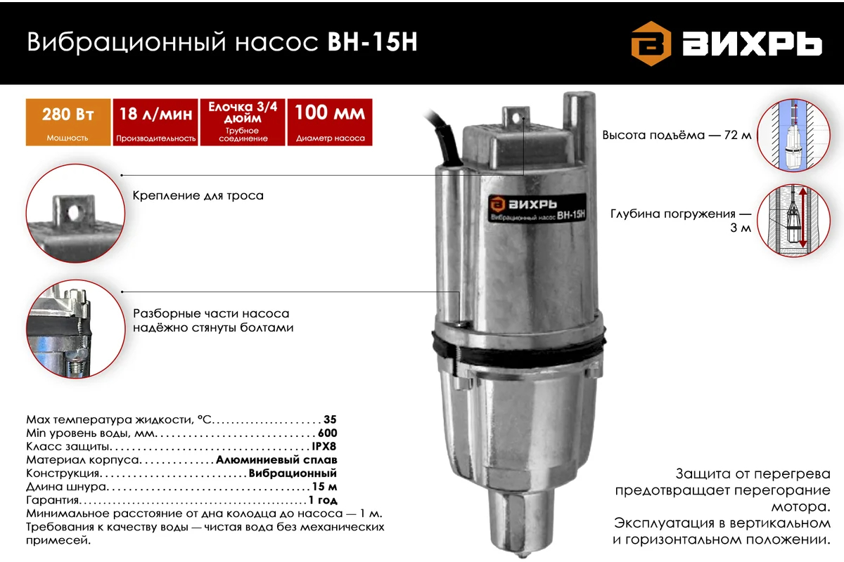 Компактный вибрационный насос Вихрь ВН-15Н может подавать воду из колодцев или природных источников, поднимая ее на высоту до 72 м, однако глубина погружения самого насоса ограничена 3 м.