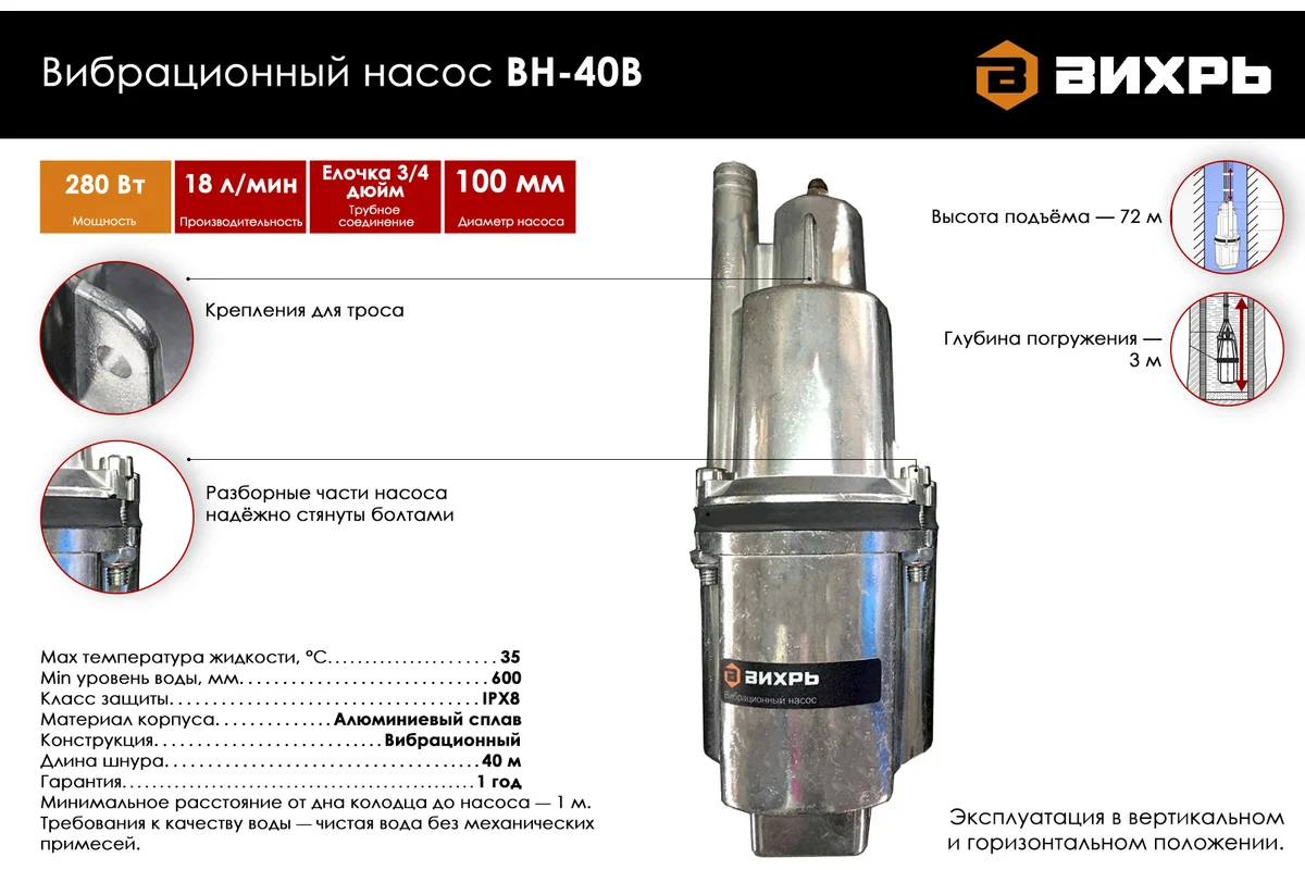 Погружной насос Вихрь ВН-40В станет отличным помощником в обеспечении вашего дома или участка водой, предлагая оптимальное сочетание производительности, надежности и удобства эксплуатации.