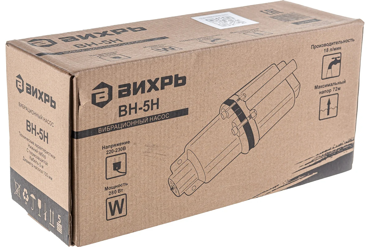 Вибрационный насос Вихрь ВН-5Н – отличное решение для подачи воды из различных колодцев, водоемов, резервуаров. Погружать в воду разрешается на глубину до 3 м. Мощность прибора составляет 280 Вт. Он может подавать воду на высоту до 72 м и на большие расстояния горизонтально. По этой причине часто используется для полива.