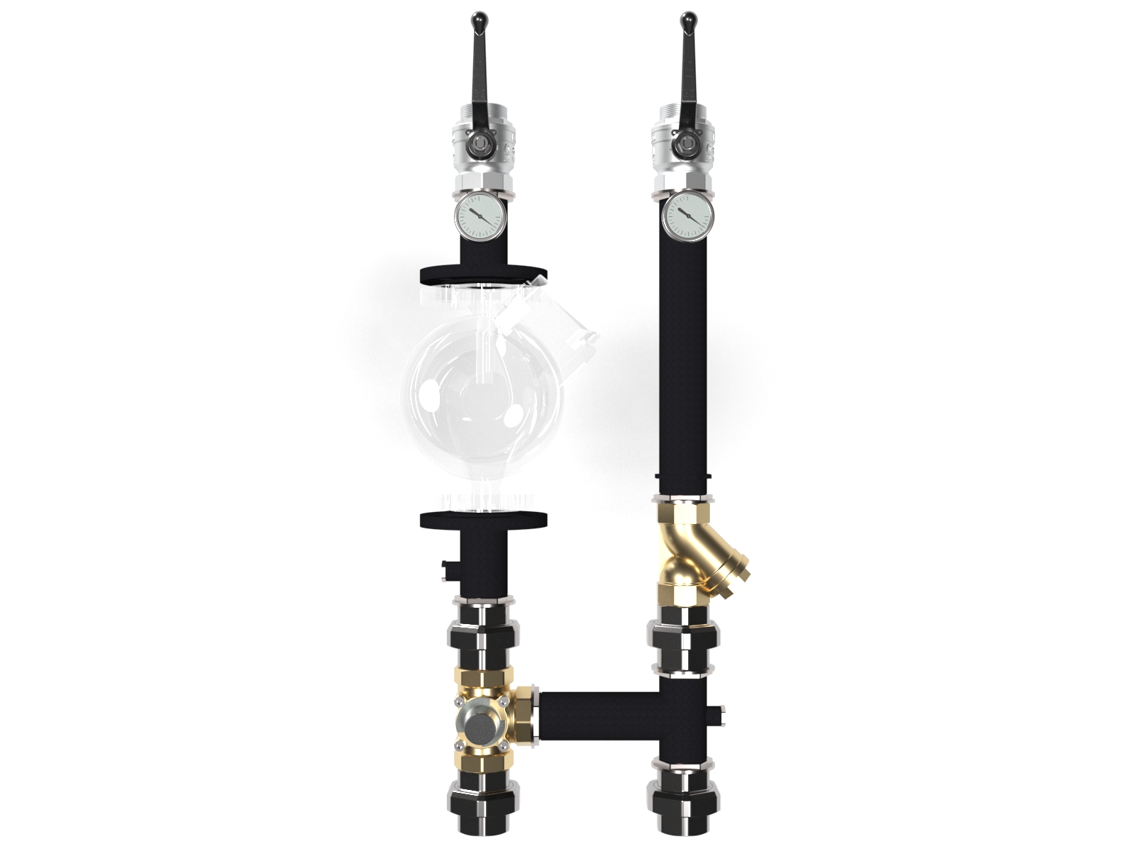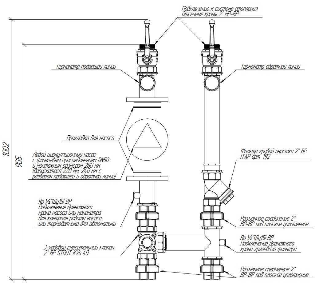 Насосная группа NG-50C с поворотным смесителем под сервопривод предназначена для обвязки контура потребителя с регулируемой температурой (теплые полы, радиаторы и прочее).