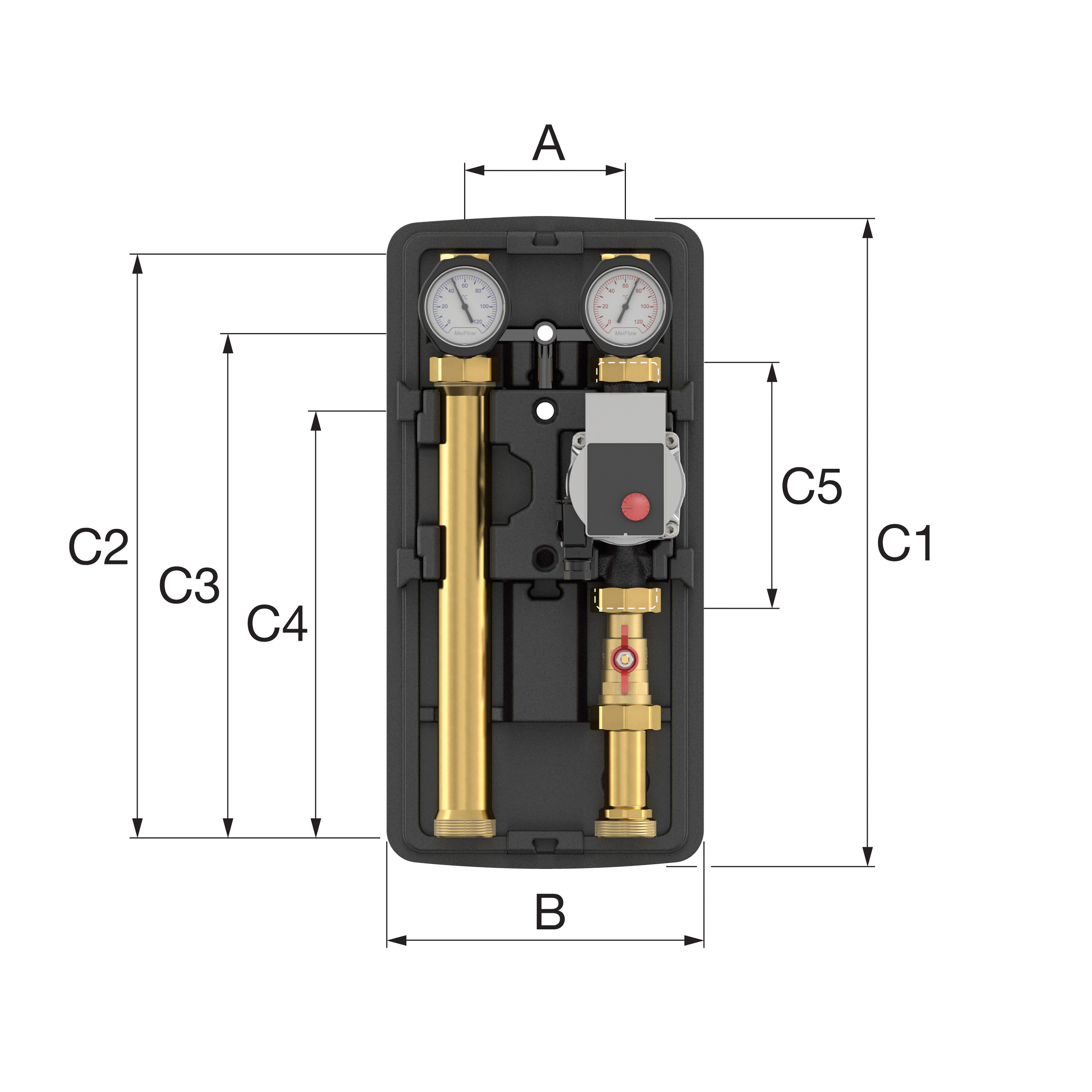 Насосная группа Meibes MeiFlow Top S UC-L прямая, увеличенной длины и с дополнительным шаровым краном после трехходового смесительного контура. Применяется в случае необходимости установки шарового крана между трехходовым клапаном и насосом, например для обслуживания.