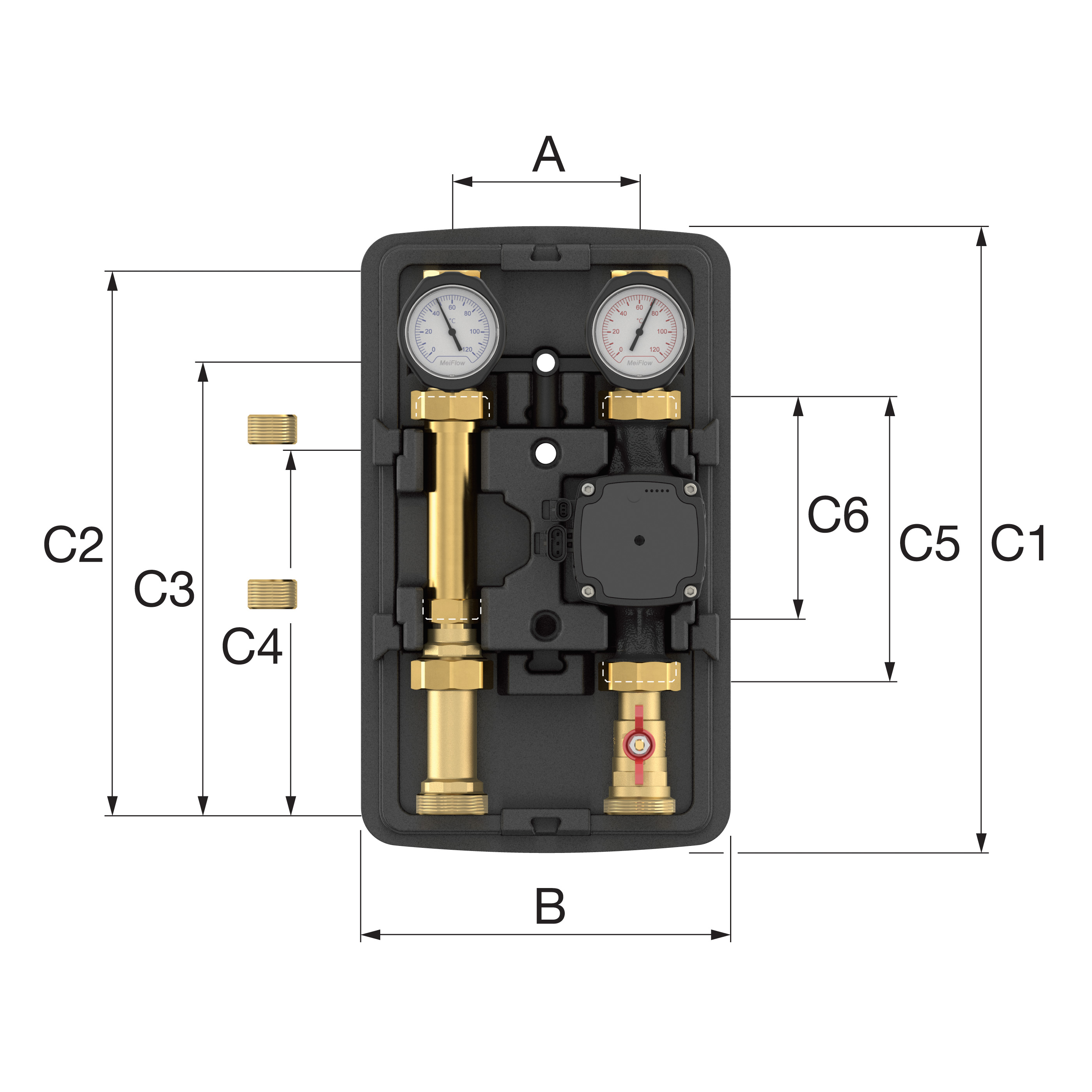 Насосная группа Meibes MeiFlow Top S US-M прямая с местом под теплосчетчик. Контур с возможностью теплового учета потребления. Применяется в случаях учета теплопотребления, например подключения отдельных потребителей с их теплоучетом.