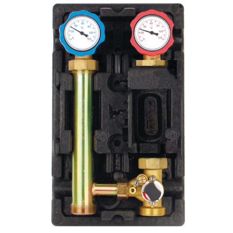 Насосная группа Rommer с термостатическим смесительным клапаном (35-60°С) 1"" без насоса применяется в контурах отопления, где необходимо регулировать температуру теплоносителя, например, теплый пол.