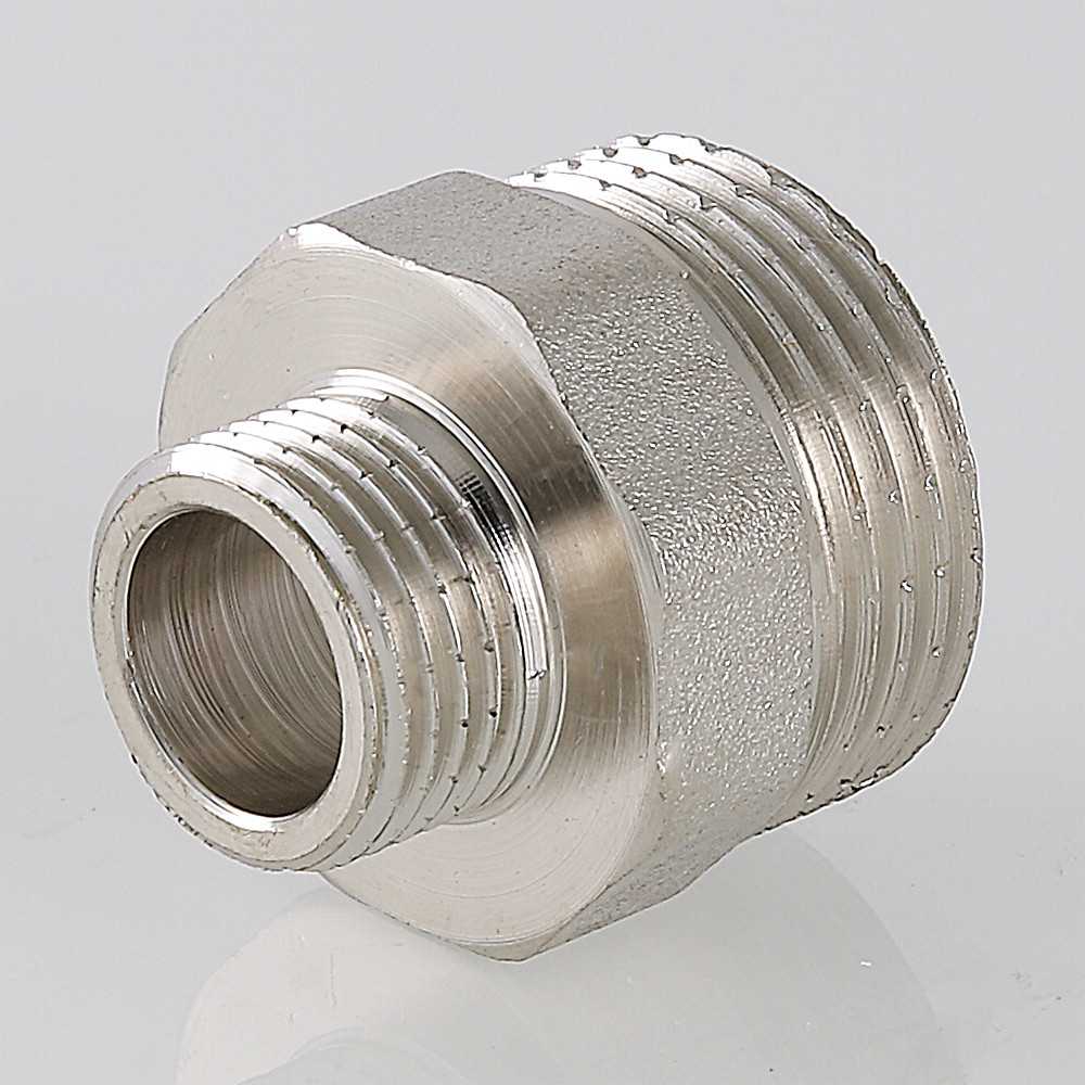 Резьбовой фитинг – ниппель переходной. Обеспечивает соединение элементов трубопровода разного диаметра. Выполнен из латуни CW617N (евростандарт EN12165) горячим штампованием с последующим никелированием. Резьба обоих патрубков – наружная (тип – цилиндрическая трубная, ГОСТ 6357, ISO 228, EN10226). Насечки на резьбе способствуют удержанию герметизирующего материала (например, сантехнического льна). Наличие шестигранного (под гаечный ключ) участка корпуса облегчает монтаж соединения. Максимальная температура использования ниппеля составляет 250 °С (при максимальном рабочем давлении 2,7/1,7 бар – для моделей условным диаметром до/более 1”).