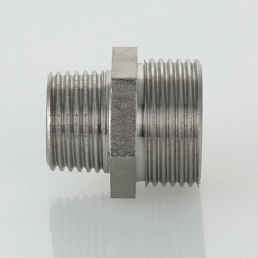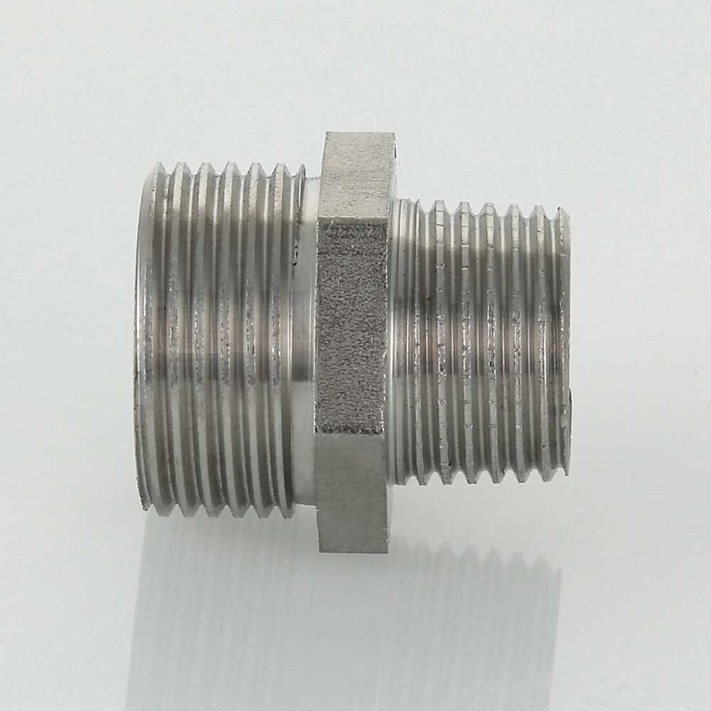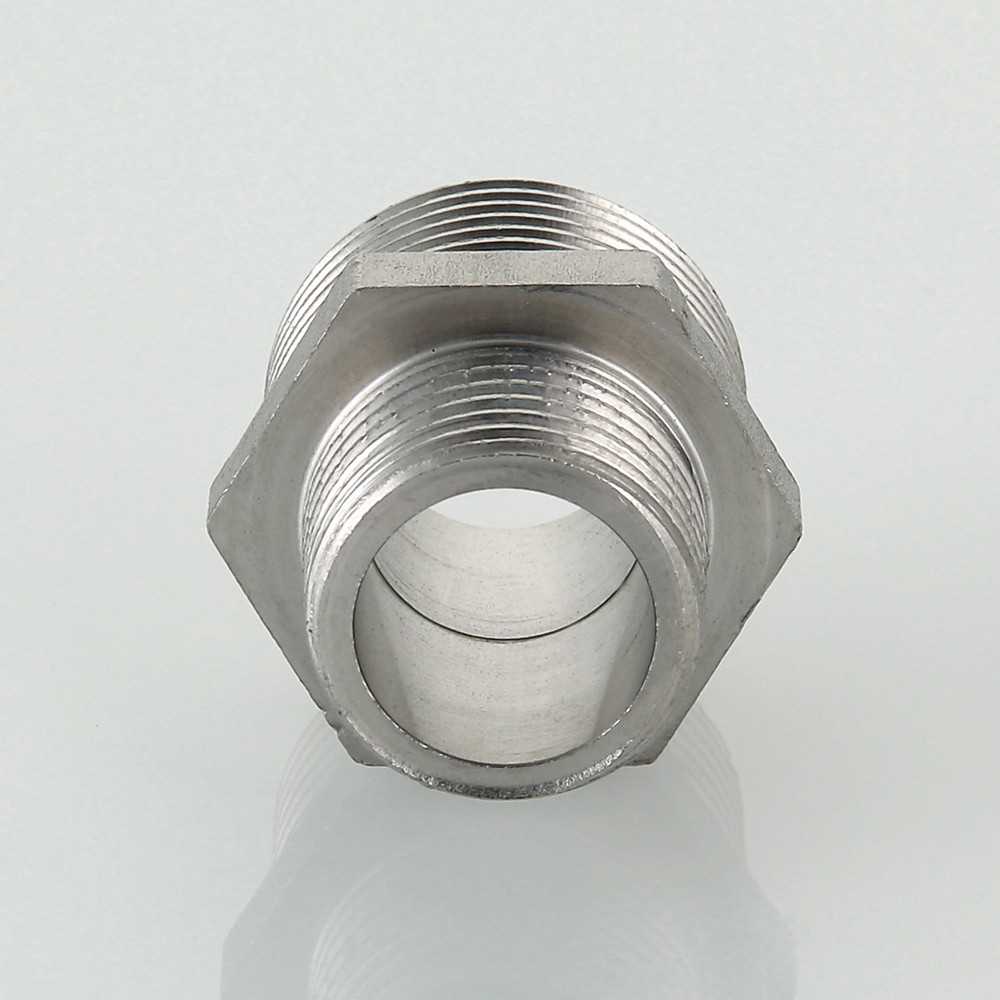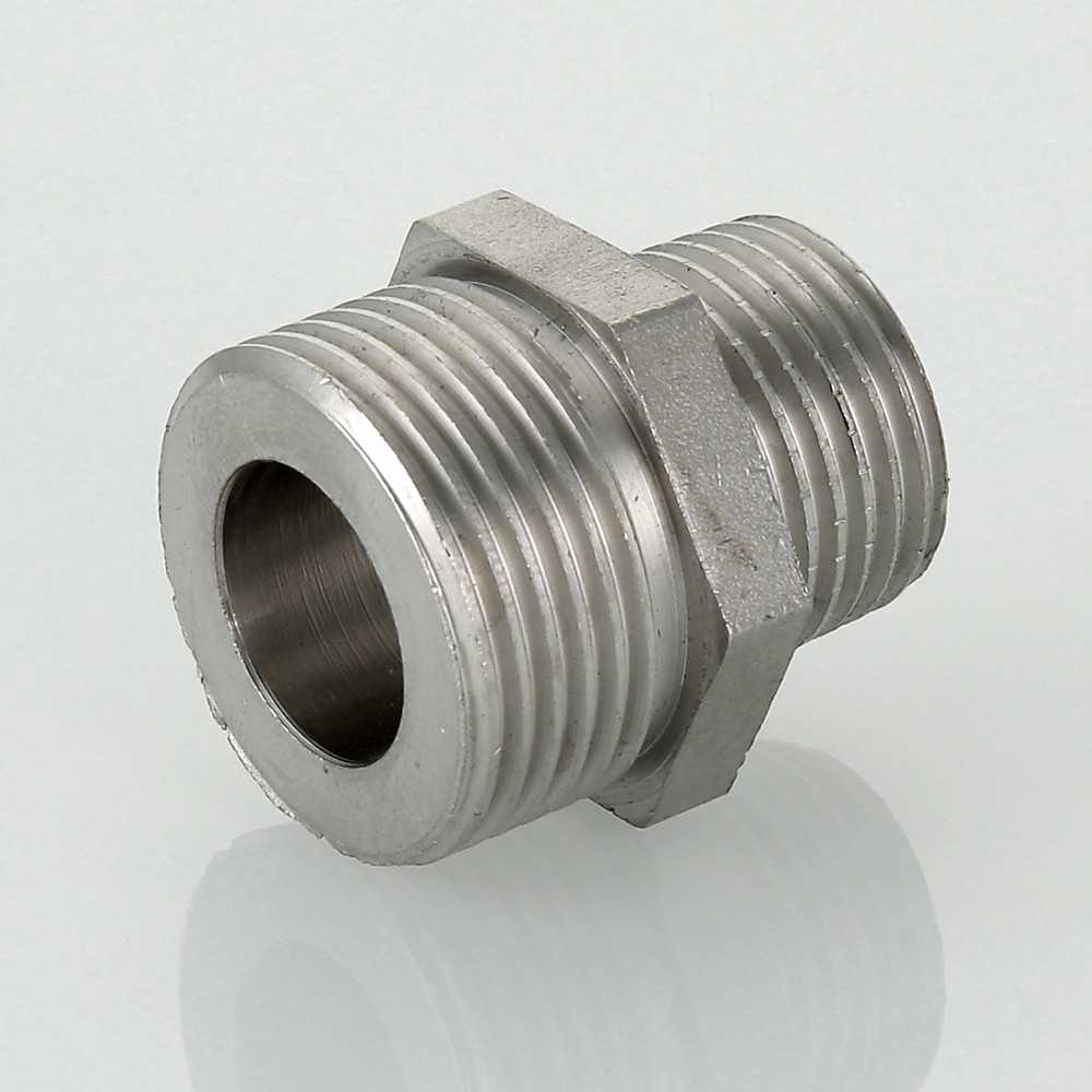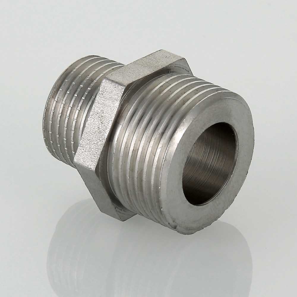 Ниппель переходной из нержавеющей стали в составе системы VT.INOX-PRESS предназначен для соединения элементов с внутренней резьбой разных диаметров. Резьба патрубка меньшего диаметра имеет насечки – для эффективного удержания уплотняющего материала. Шестигранный – под гаечный ключ – участок корпуса облегчает монтаж соединения. Материалом фитинга служит сталь марки AISI 304, устойчивая к коррозии, химическому и термическому воздействию. В то же время область рекомендуемого применения фитингов VT.INOX-PRESS исключает трубопроводы жидких углеводородов и хлороводородных растворов.