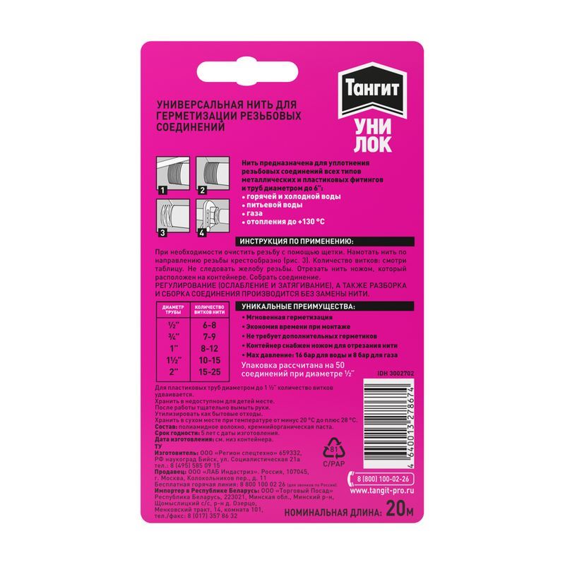 Нить для герметизации резьбовых соединений Тангит Уни-Лок 20 м. (на блистере) (3002702)