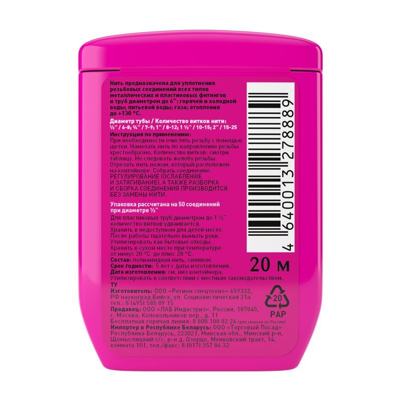 Применяется для герметизации снабженных резьбой узлов, такие как муфты и фитинги труб, как с цилиндрической, так и конической резьбой. Диапазон эксплуатации: подача холодной, горячей воды и газа.