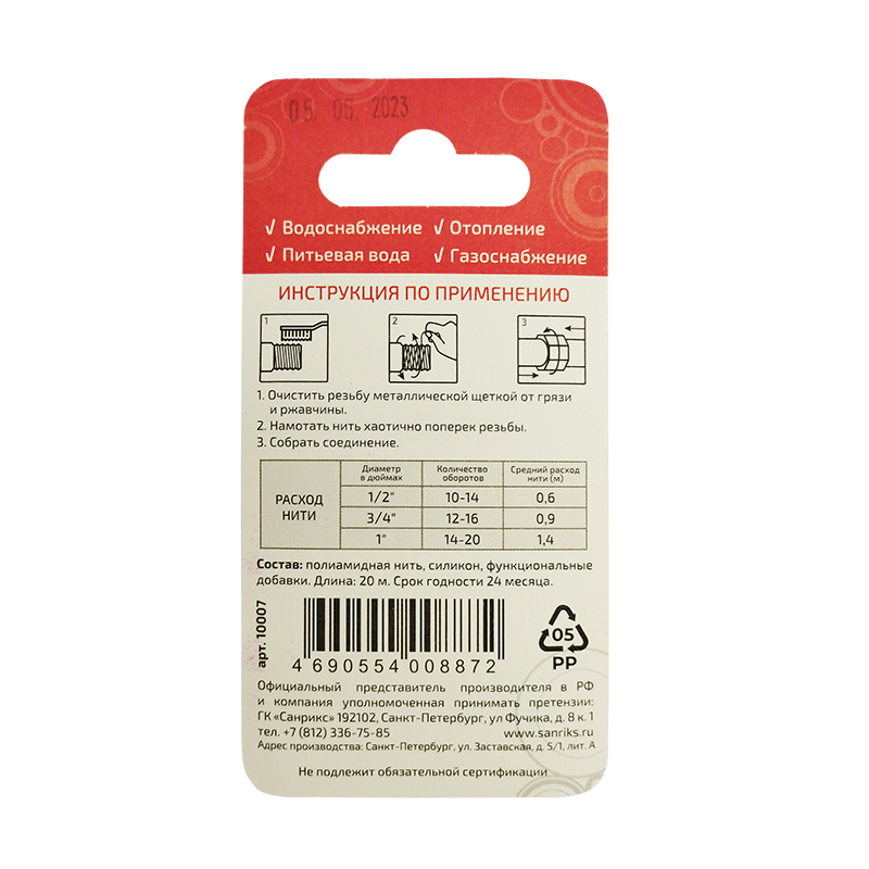 Применяется для всех типов металлических и пластиковых труб и фитингов диаметром до 6 дюймов. Нить устойчива к воздействию температур от -20С до +130С и давления до 16 бар для воды и до 8 бар для газа.