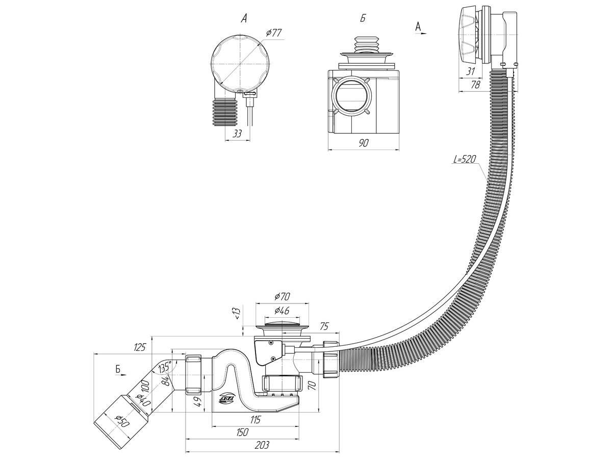 Обвязка для ванны АНИ полуавтомат 580 мм. (с сифоном Бриг, с переходной трубой 45° 40/50 мм., ручка металл) АНИ пласт (EM361)