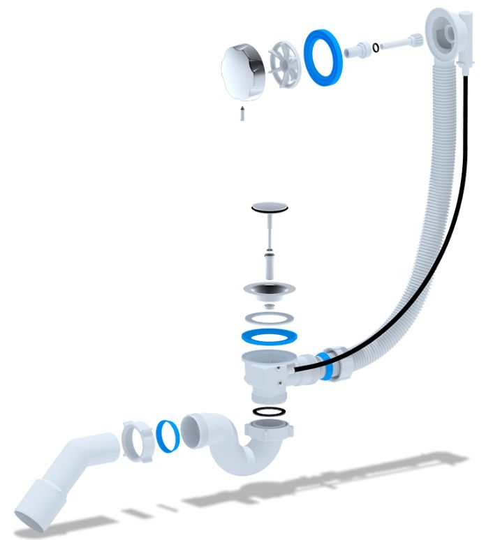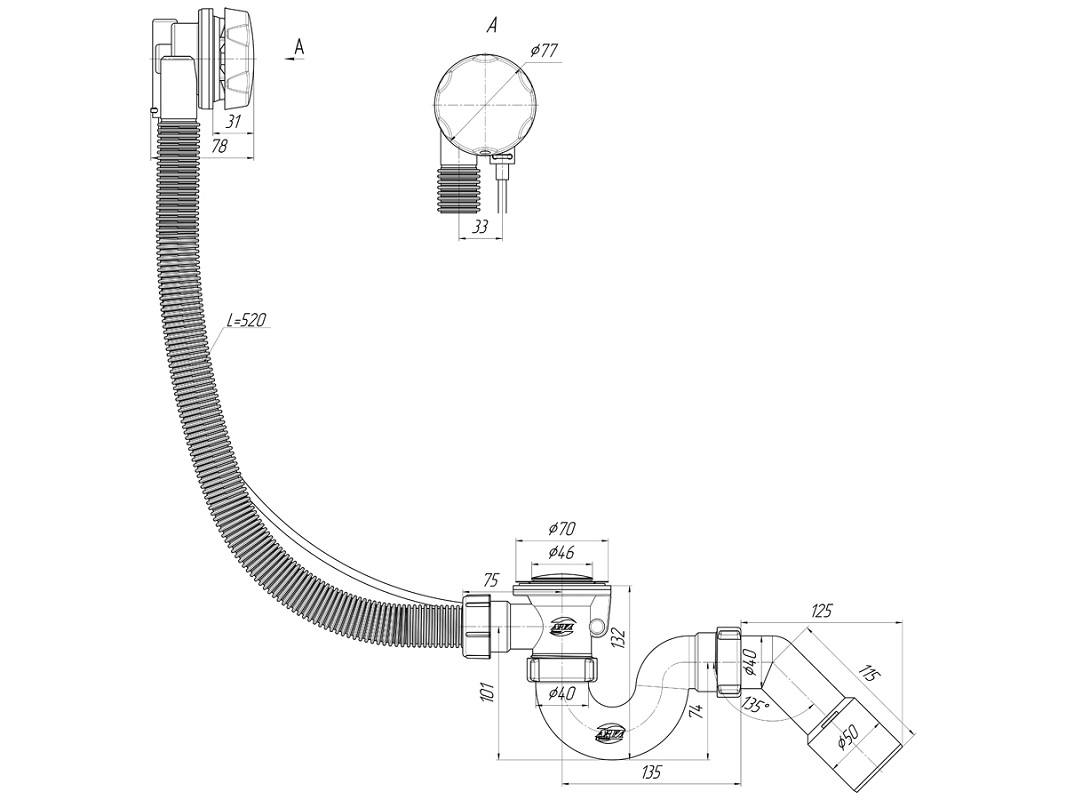 Обвязка для ванны АНИ полуавтомат 580 мм. (с трубным сифоном, с переходной трубой 45° 40/50 мм., ручка металл) АНИ пласт (EM611)