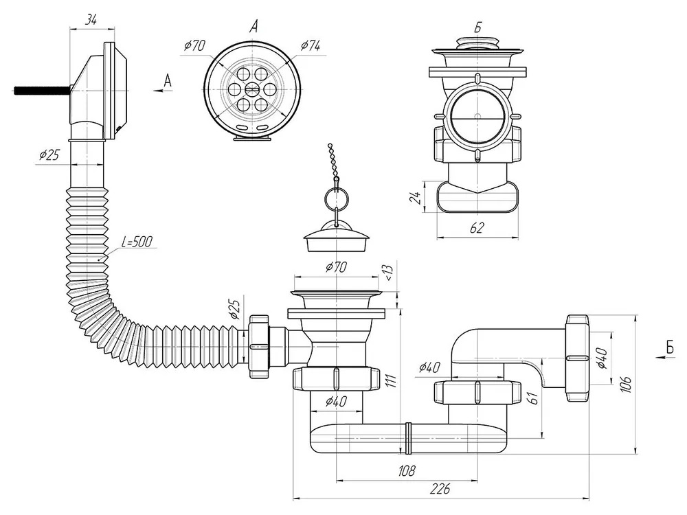Форма сифона позволяет поддерживать хорошую пропускную способность слива сточной воды, выполняя свою главную функцию - формирование гидрозатвора для отсечения неприятных запахов из канализации. Сифон прост в установке.