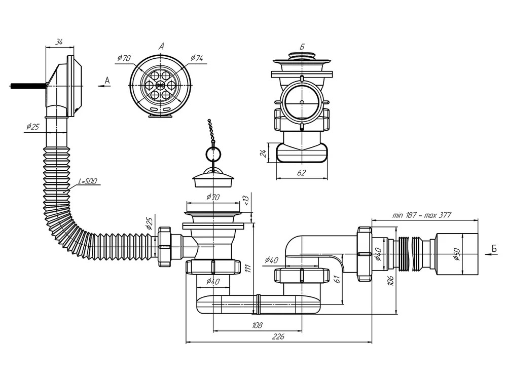 Форма сифона позволяет поддерживать хорошую пропускную способность слива сточной воды, выполняя свою главную функцию - формирование гидрозатвора для отсечения неприятных запахов из канализации. Сифон прост в установке.