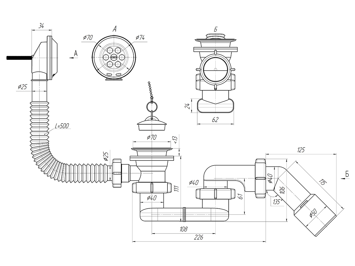 Сифон для ванны для подключения к канализации комплектуется переходной трубой 45° 40*50мм