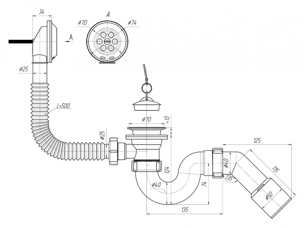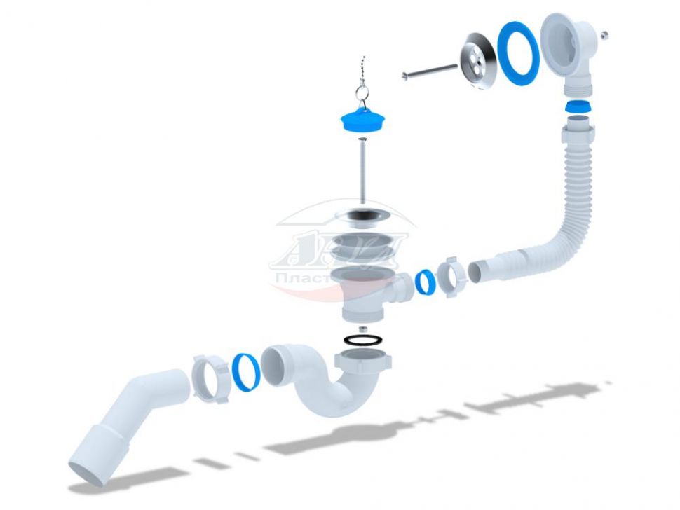 Сифон для ванны для подключения к канализации комплектуется переходной трубой 45° 40*50мм