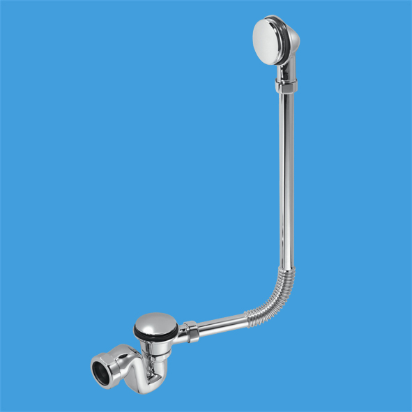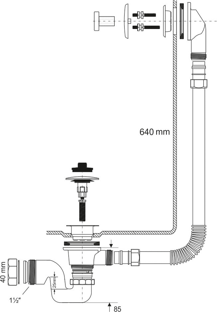 Обвязка для ванн с переливом (L640ммхD25мм), металлическими 70мм сливной решеткой и пробкой тип-"кнопка", высота гидрозатвора 25мм, выход компрессионный Ду=40мм, цвет-хром