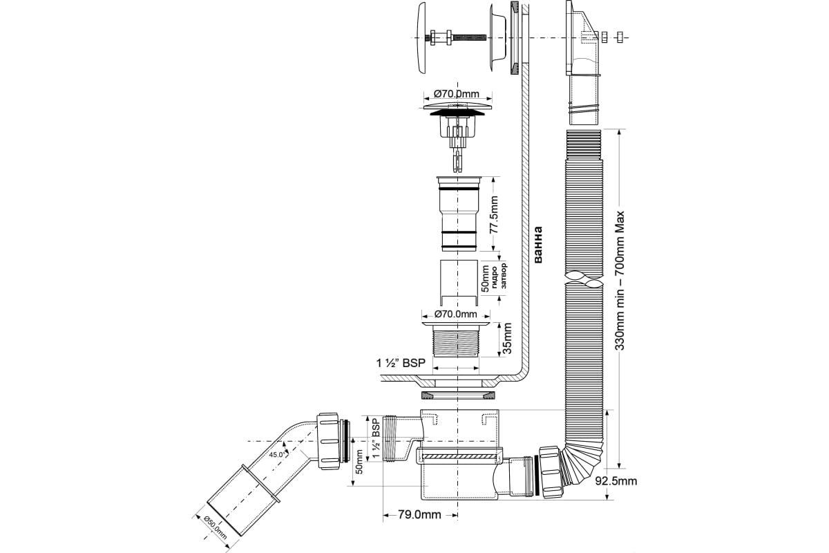 Обвязка для ванны McAlpine 1-1/2"x40 мм с переливом L700 D34мм гидрозат.50мм, белая (MRB11-WH)