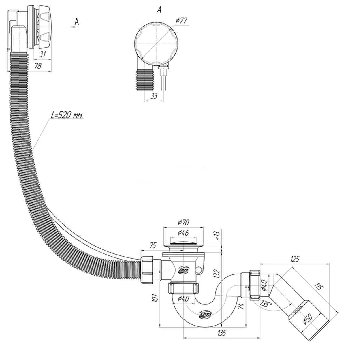 Комплектация: Корпус сифона, накладка, пробка, решетка слива, монтажный набор, уплотнение