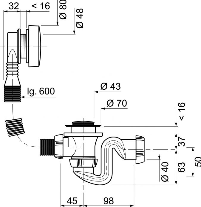 Сифон WIRQUIN ELTON (30717564), автомат для ванны, компактный, слив 62 л/мин, защита троса, вентиль ABS хром, перелив 600 мм, клапан латунь