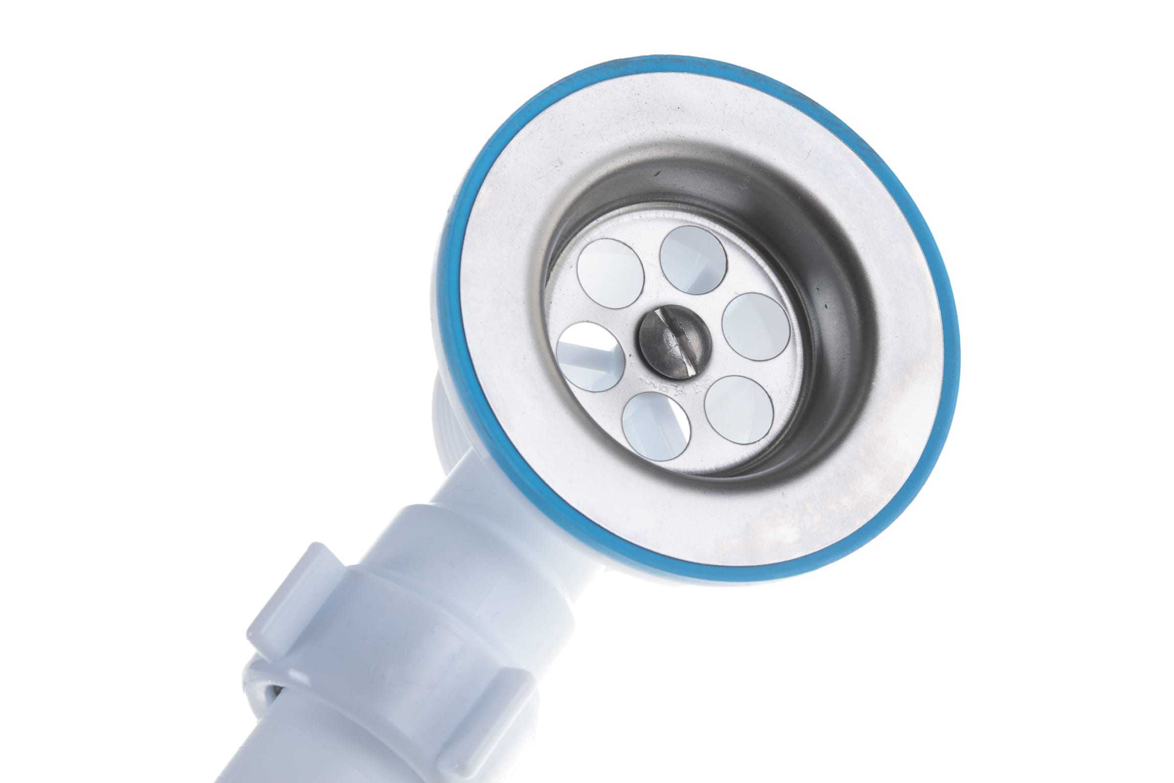 Труба сифона жесткая диаметром 40 мм, подключение к канализации с помощью гофрированной трубы с выходом на 50 мм, длина варьируется от 220 до 410 мм.