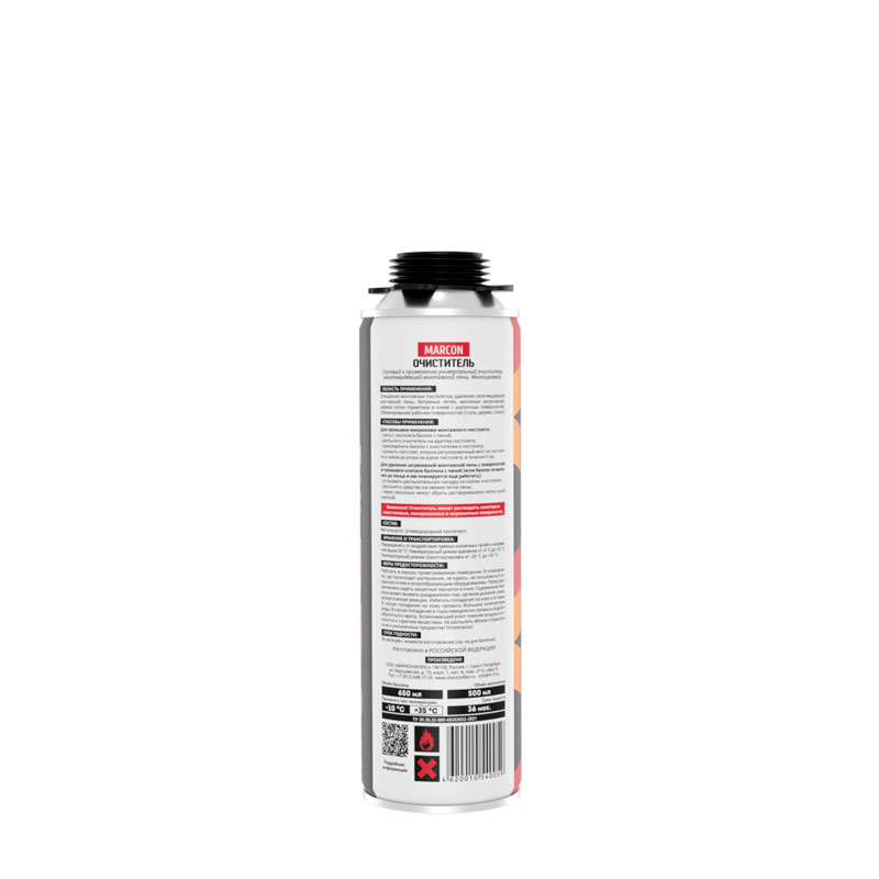 Пистолетный очиститель монтажной пены MARCON универсальный. Очищение монтажных пистолетов, удаление незатвердевшей монтажной пены, битумных пятен, масляных загрязнений, свежих пятен герметика и клеев с различных поверхностей. Обезжиривание рабочих поверхностей (сталь, дерево, стекло). Основа состава - метил ацетат/ацетон. Диапазон рабочих температур -10 +35. Срок годности 36 месяцев.