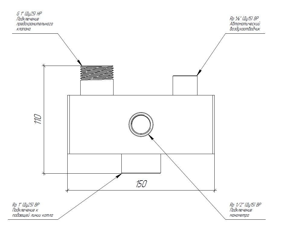 Основание группы безопасности предназначено для самостоятельной комплектации автовоздушником, манометром и предохранительным клапаном и последующей установкой на подающей линии напольного котла без установки какой-либо запорной арматуры.
