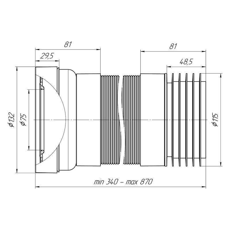 Длина трубы 340-870мм, присоединение к унитазу через EPDM муфту (каучук, сохраняющий отличную эластичность в широких температурных режимах, устойчивый к химическим воздействиям), выход на канализацию 110 мм. Удлинители гибкие выполняют функцию фановых труб и предназначены для соединения унитаза с канализационной трубой. Основное преимущество в том, что они легко монтируются и нет необходимости заранее замерять угол и расстояние (как в случае с фановыми трубами).