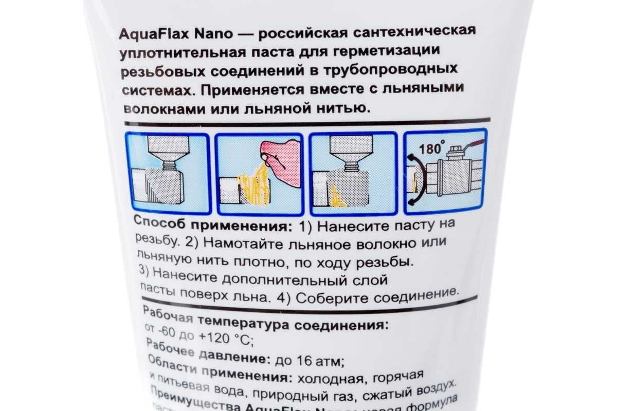 Уплотнительная паста Aquaflax nano тюбик 80 гр. 04041 предназначена для герметизации резьбовых соединений в различных средах. Применяется только вместе со льном! Специально разработанная формула пасты AQUAFLAX NANO имеет наночастицы, которые позволяют быстро и эффективно проникать в структуру льна и надежно уплотнять резьбу. Ее формула не пачкает инструмент и руки мастера и легко стирается без использования воды.