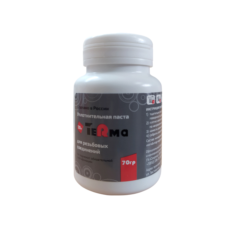 Уплотнительная паста TeRma применяется для уплотнения резьбовых соединений в трубопроводных системах горячей и холодной воды, а также системах отопления. Используется в сочетании с льняными волокнами и при необходимости позволяет легко разобрать резьбовые элементы. Использование пасты упрощает монтаж системы, защищает металл от коррозии, агрессивной среды, старения, пересхания и обеспечивает полную герметичность соединений на длительный срок.