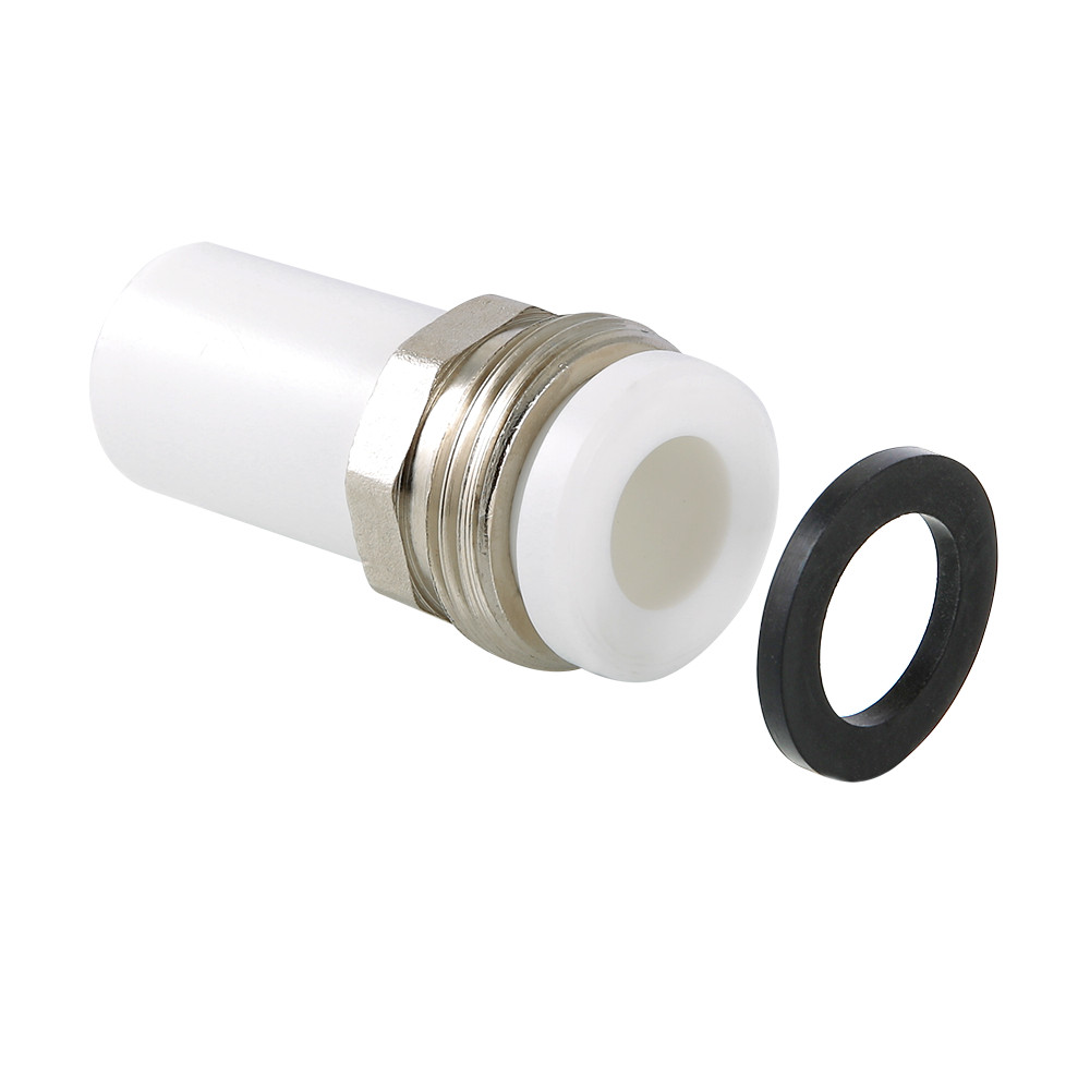Фитинг для соединения полипропиленового трубопровода и компонента инженерной системы с помощью накидной гайки. Резьба – наружная трубная по ГОСТу 6357.