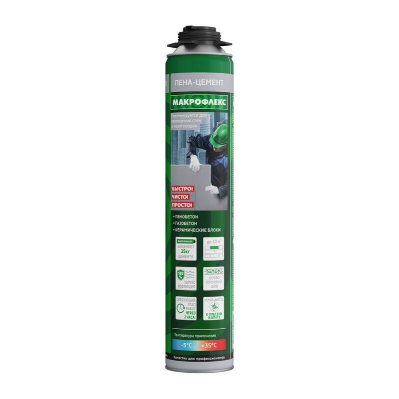 Однокомпонентная аэрозольная полиуретановая пена-цемент для соединения и крепления строительных материалов. Продукт позволяет выполнить работу значительно меньшими усилиями и помогает вдвое сократить затрачиваемое на работу время.