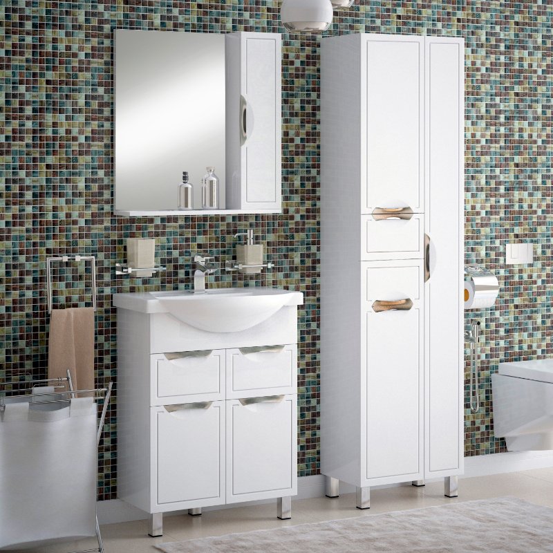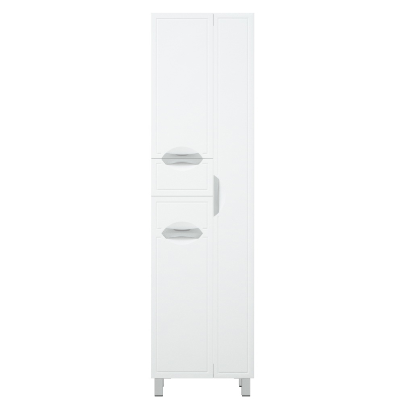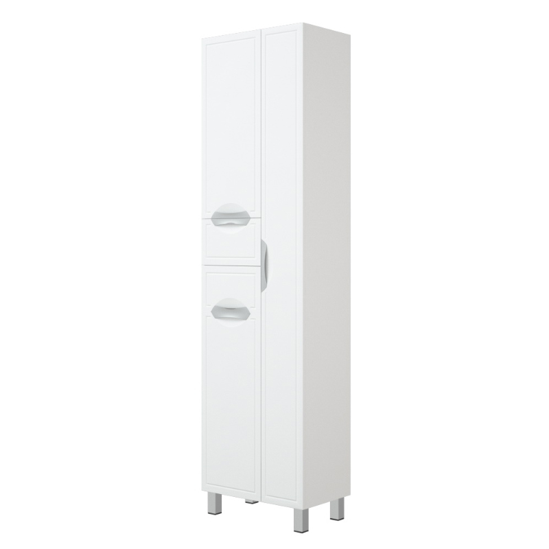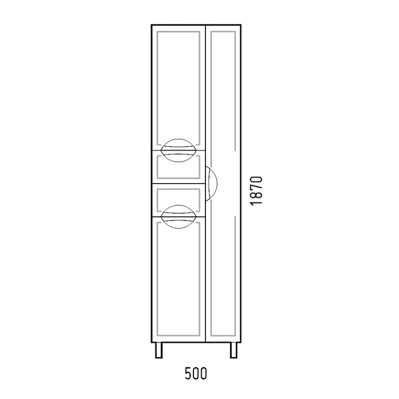 Напольный пенал Альфа 50 торговой марки Melodia della vita с габаритными размерами 500х291х1870 это стильное и эргономичное решение для вашей ванной комнаты. Колонна совместима со всеми тумбами и зеркальными шкафами серии Альфа. У пенала Альфа две распашные двери сверху и снизу, позади вкладные полки. По центру два выдвижных ящика на шариковых направляющих. Высота ящиков 110 мм. Справа узкая дверь, за которой ниша для халатов. В ней установлены два крючка под одежду. Все двери на петлях с доводчиками. У пенала четыре мет. опоры. Пенал является ""перевёртышем"" - может быть как правого, так и левого открывания. Поставляется в собранном виде в комплекте с крепежом и ножками.