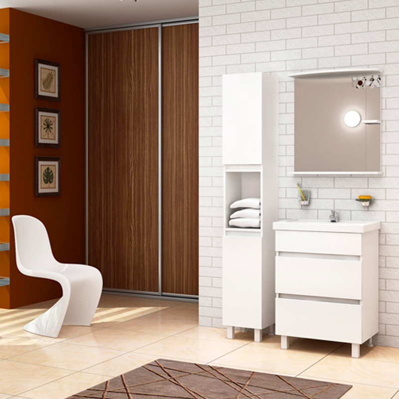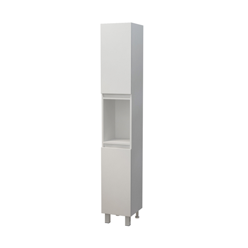 Пенал Модерн выполнен из влагостойких материалов, имеет стильный дизайн и много места для хранения: открытая полка по центру и два шкафчика с дверцей сверху и снизу