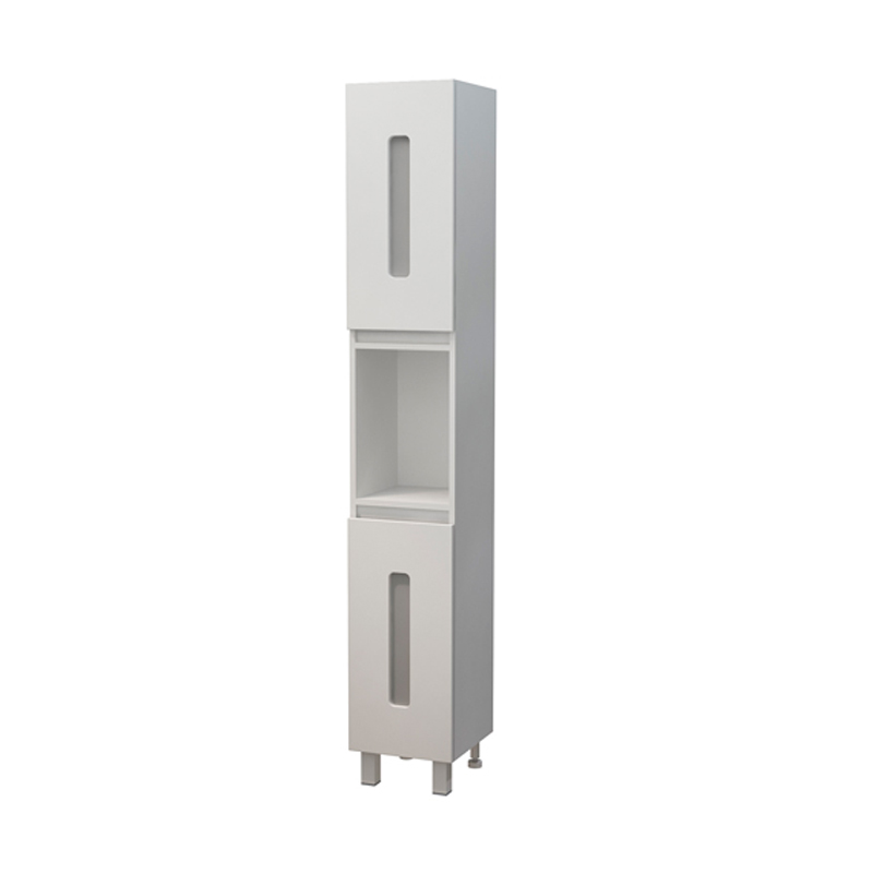 Пенал Модерн со стеклом выполнен из влагостойких материалов, имеет стильный дизайн и много места для хранения: открытая полка по центру и два шкафчика с дверцей сверху и снизу