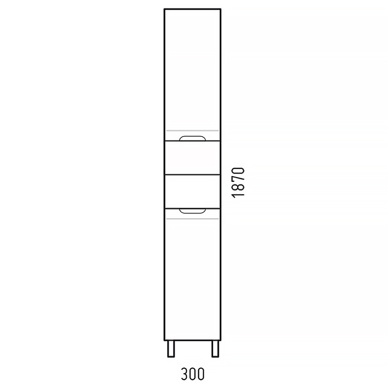 Напольный пенал Омега 30 торговой марки Melodia della vita с габаритными размерами 300х291х1870 это стильное и эргономичное решение для вашей ванной комнаты. Колонна совместима со всеми тумбами и зеркальными шкафами серии Омега. У пенала есть две распашные двери: наверху и внизу. За дверьми по две регулируемые по высоте вкладные полки. По центру располагаются два выдвижных ящика на шариковых направляющих. У пенала четыре мет. хром опоры. Пенал является ""перевёртышем"" - двери могут быть правого или левого открывания. Для этого опоры перекручиваются с нижней полки и устанавливаются на верхнюю. Ящики снимаются и переворачиваются. Крепление к стене осуществляется через внутреннюю горизонтальную царгу сверху. Вместо ручки - красивый вырез по центру, снизу полоса тонкой фрезеровки. Поставляется в собранном виде в комплекте с крепежом и ножками.