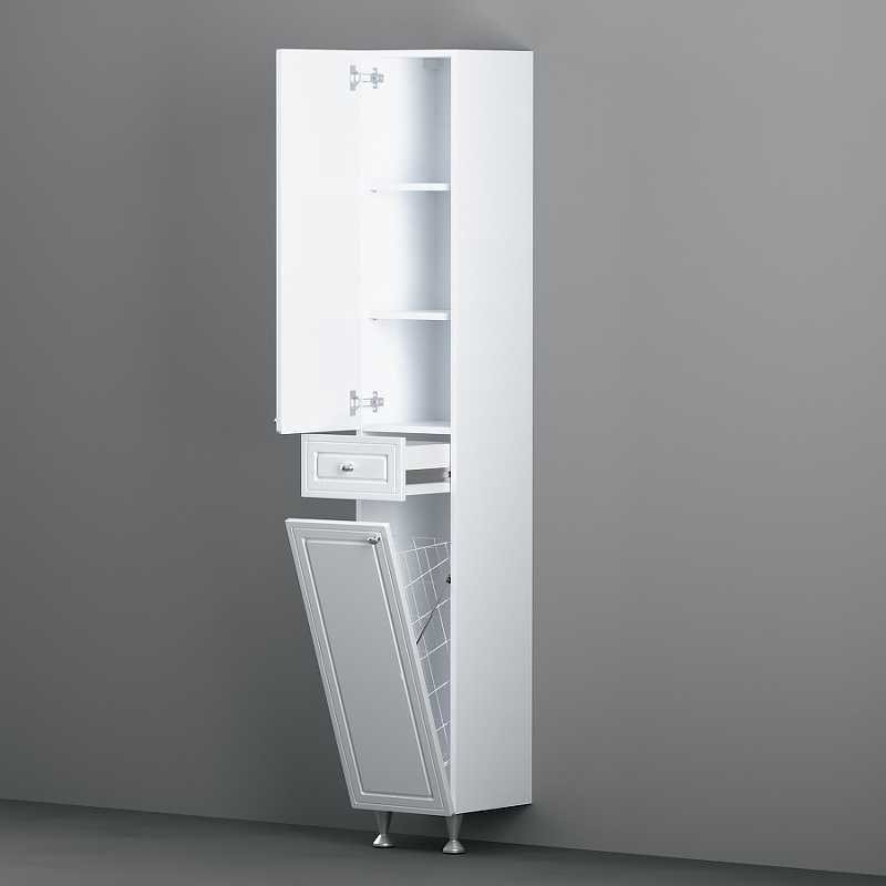 С двумя распашными дверцами, двумя полками, выдвижным ящиком и бельевой корзиной.