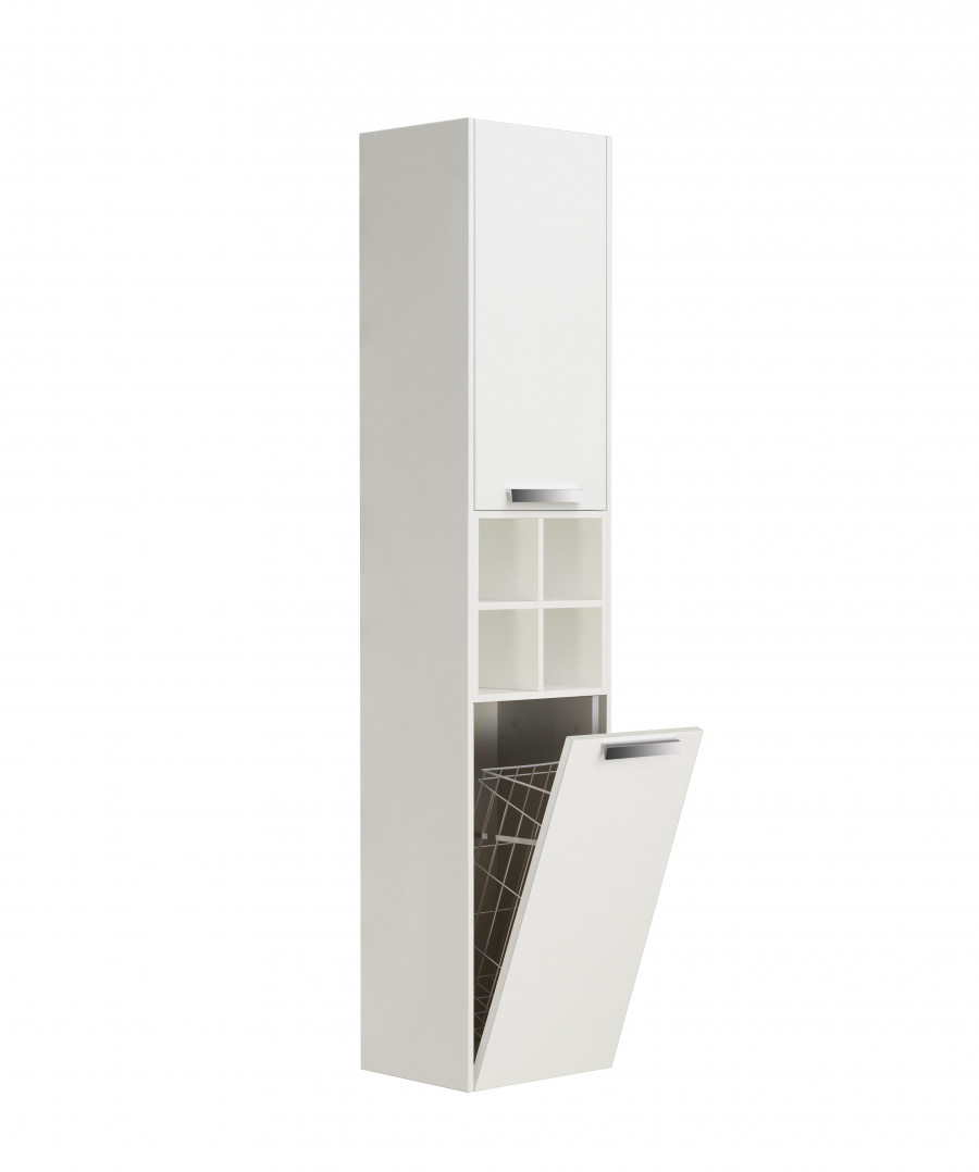 Шкаф-колонна Lago в современном стиле от испанского бренда Roca, выполненная из высококачественной влагостойкой ЛДСП и МДФ в цвете белый глянец, с бельевой корзиной. Покупатель самостоятельно определяет сторону открытия фасада верхнего ящика налево или направо, путем навешивания петель на корпусе изделия.
