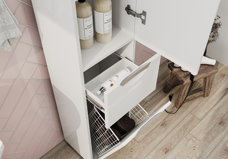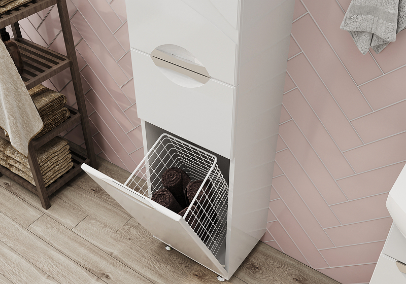 Система хранения: 1 распашная дверца две стеклянные полки), 1 выдвижной ящик, откидная дверца с корзиной для белья.