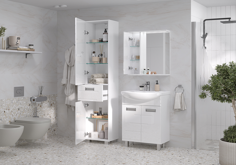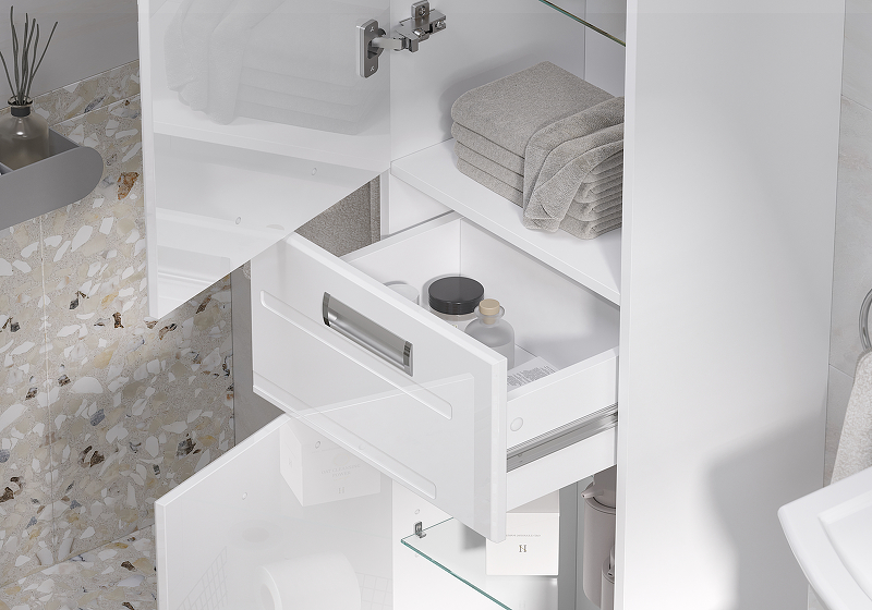 Система хранения: 2 распашные дверцы (в верхней секции две стеклянные полки, в нижней секции одна стеклянная полка), 1 выдвижной ящик.