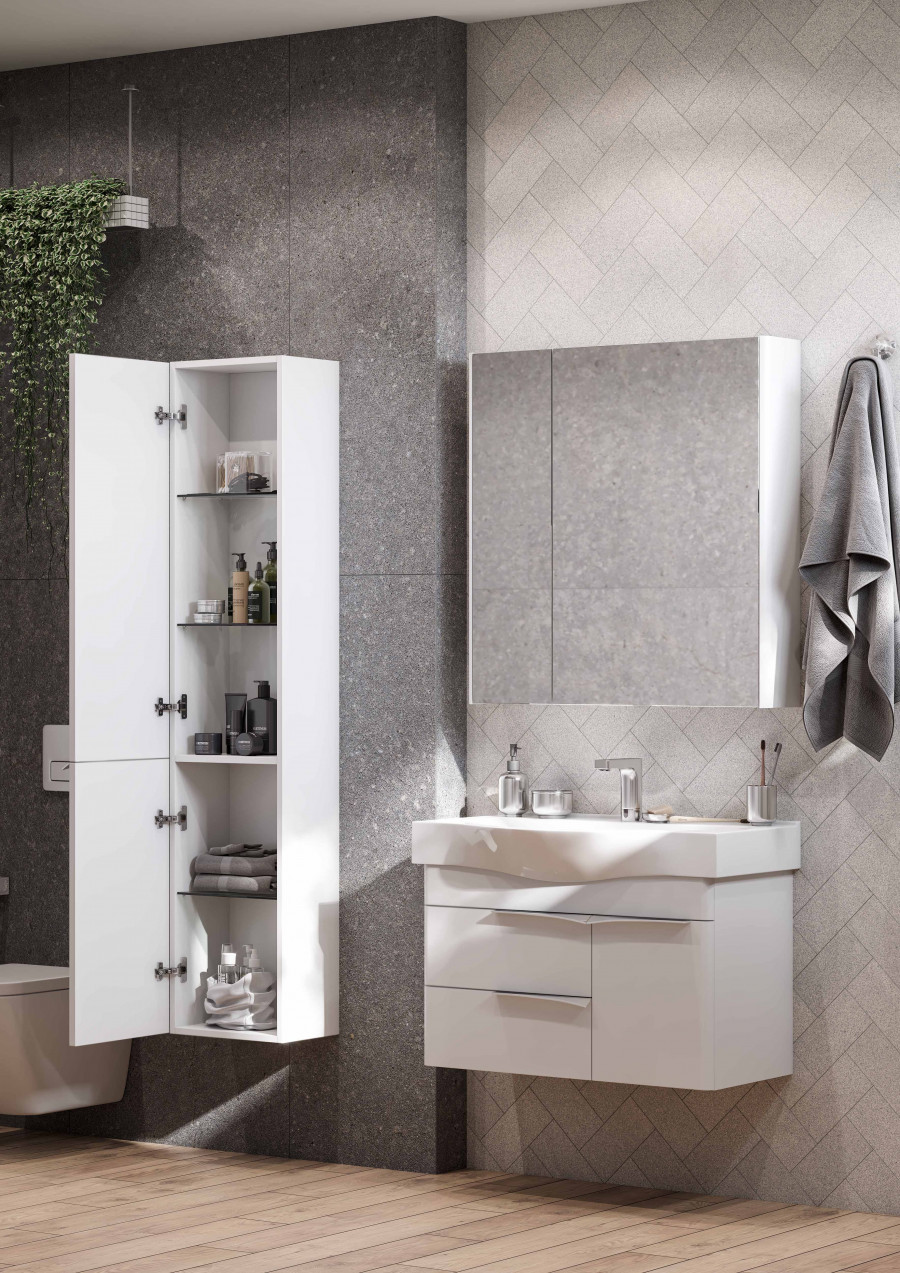Шкаф-колонна Беверли в современном стиле выполнена из влагостойкой ламинированной плиты и высококачественной MDF. Верхний фасад открывается с помощью системы Push-to-open, нижний фасад снабжен изящной хромированной ручкой и петлями с доводчиками. За фасадами шкафа-колонны находятся вместительные отделения со стеклянными регулируемыми по высоте полками. Шкаф-колонна окрашена в белый цвет с высокой степенью глянца, что обеспечивает изделию привлекательный внешний вид, а также износостойкость и долговечность.