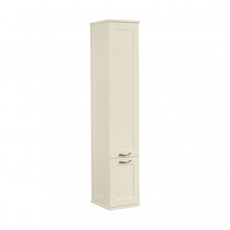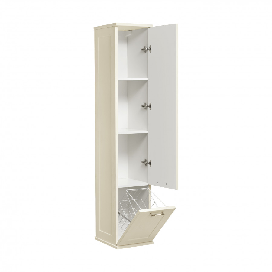 Подвесной шкаф-колонна Леон выполнен в классическом стиле в теплом цвете дуб бежевый из высококачественной МДФ, оснащен изящной фурнитурой с цветочным орнаментом и имеет матовое влагостойкое покрытие. За верхним фасадом располагаются полки, на которых удобно разметить необходимые в ванной комнате принадлежности, в нижней части шкафа расположена бельевая корзина-функциональная деталь, незаменимая в ванной комнате. Данный шкаф может быть как в левом, так и в правом исполнении, а поскольку его петли оснащены механизмом плавного довода, это обеспечивает мягкое и бесшумное закрывание дверок.
