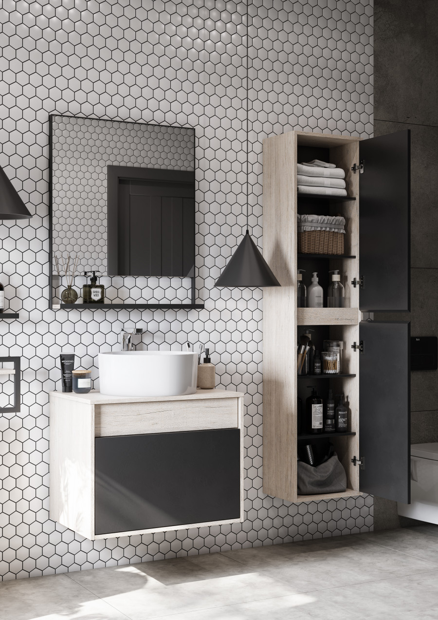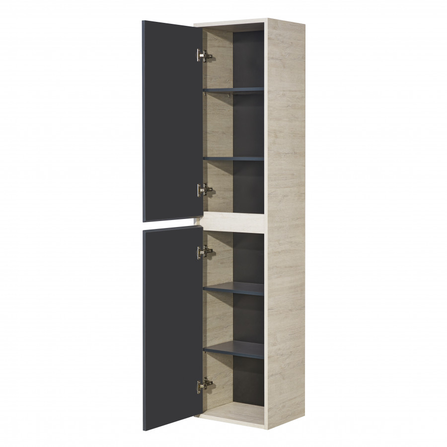 В качестве дополнительного места для хранения можно использовать шкаф-колонну с двумя отделениями. Фасады, как и у тумбы, выполнены в цвете графит с эффектом perfect touch и снабжены удобными интегрированными ручками. За фасадами находятся полочки, на которые можно разместить все необходимые принадлежности. Верхняя и нижняя полки имеют возможность регулировки по высоте.