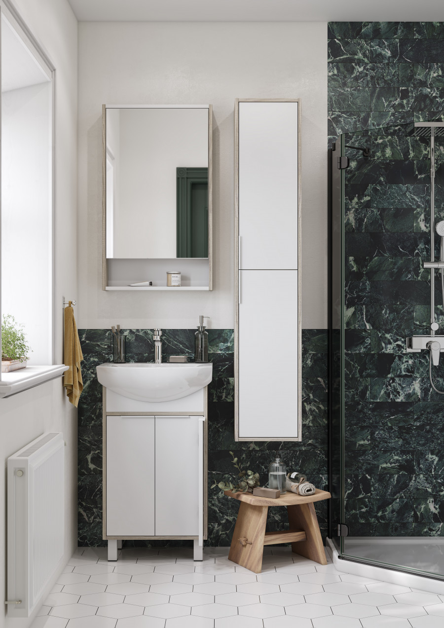 Подвесной шкаф-колонна Рико прост и функционален. Белоснежный цвет фасадов в сочетании с боковыми стенками цвета ясень фабрик придадут ванной комнате ощущение свежести и чистоты. По фасаду идут две дверцы, что позволяет по необходимости открывать только верхнюю или нижнюю часть колонны. Петли с механизмом плавного довода обеспечивают мягкое и бесшумное закрывание дверок. Фасады изделия выполнены из высококачественной МДФ. Белое глянцевое покрытие, благодаря полиэфирной краске ультрафиолетового отверждения, позволяет защитить поверхность от внешних воздействий. Колонна оснащена белой фурнитурой и может быть использована как в левом, так и в правом исполнении, благодаря опции перевешивания фасадов.