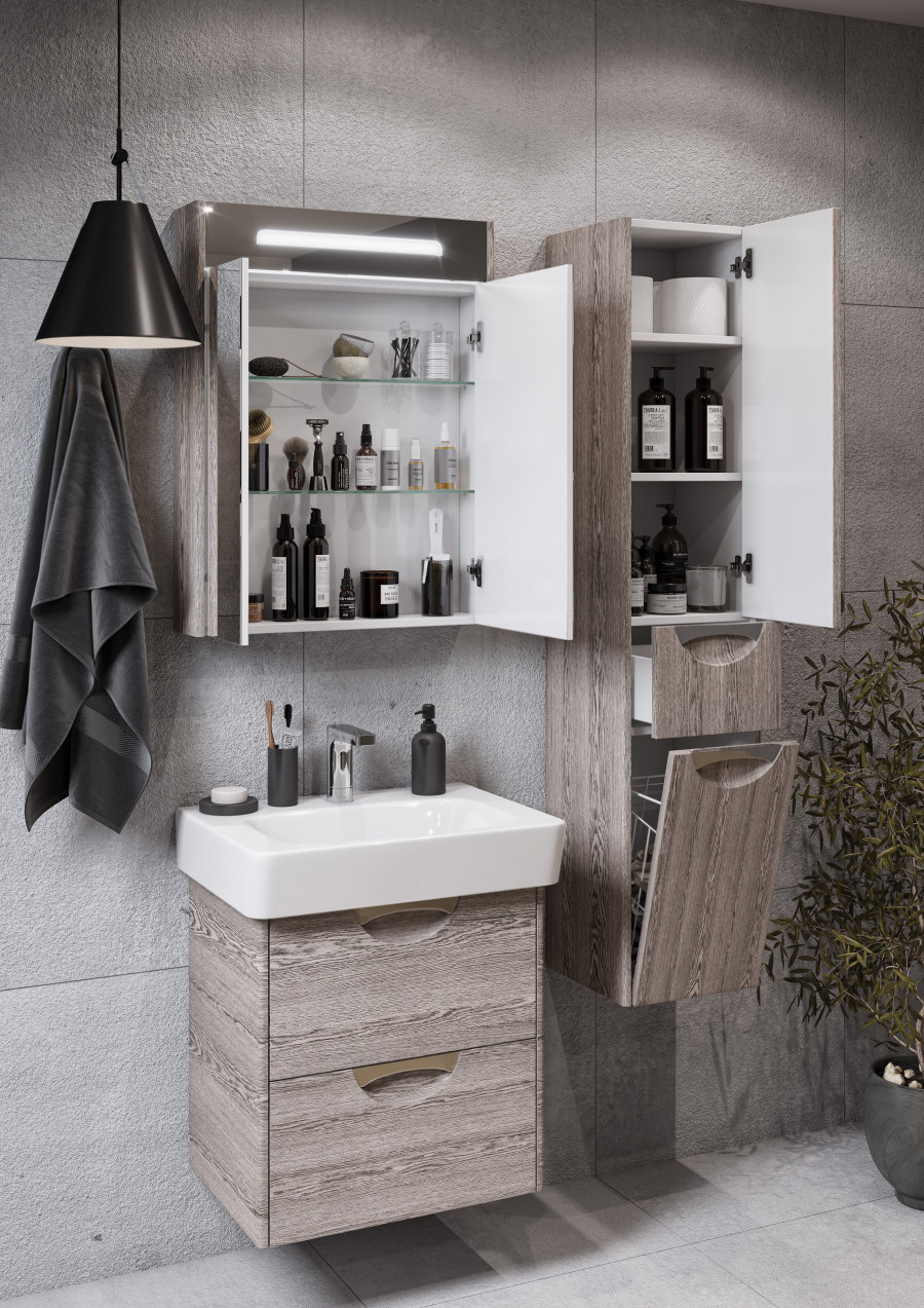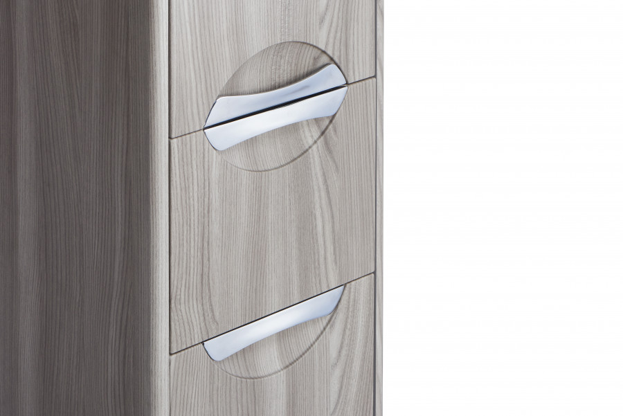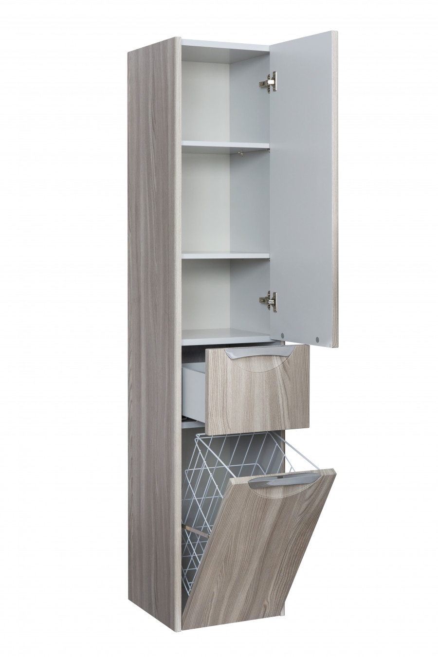 В подвесном шкафе-колонне Сильва оптимально сочетаются функциональность, тепло древесных мотивов и современный дизайн. Фасады и боковые стенки выполнены из МДФ в пленке цвета дуб фьорд, а корпус - из влагостойкой ЛДСП. Подвесная колонна состоит из двух отделений и выдвижного ящика мягкого закрывания, который бесшумен и комфортен в использовании. Пространство верхнего отделения организовано с помощью двух регулируемых полок, в нижнем отделении встроена вместительная бельевая корзина. Петли данного шкафа расположены справа. Врезные ручки - в отделке глянцевый хром.