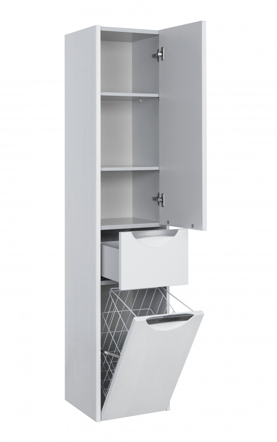 В подвесном шкафе-колонне Сильва оптимально сочетаются функциональность, тепло древесных мотивов и современный дизайн. Фасады и боковые стенки выполнены из МДФ в пленке цвета дуб полярный, а корпус - из влагостойкой ЛДСП. Подвесная колонна состоит из двух отделений и выдвижного ящика мягкого закрывания, который бесшумен и комфортен в использовании. Пространство верхнего отделения организовано с помощью двух регулируемых полок, в нижнем отделении встроена вместительная бельевая корзина. Петли данного шкафа расположены справа. Врезные ручки - в отделке глянцевый хром.